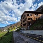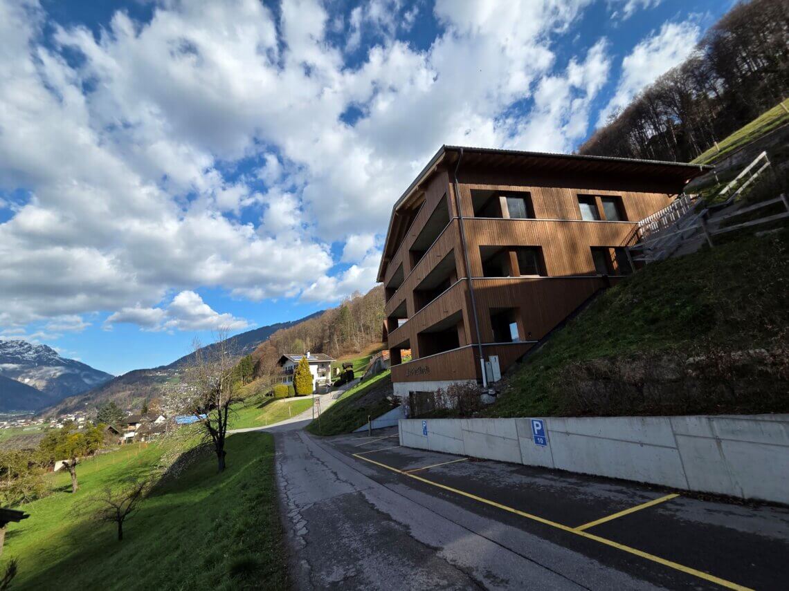Vanaf de grote weg zien we de 2 appartementencomplexen al. Wat een mooie gebouwen zo tegen de berg aan. We rijden onder de gondels van de Zamangbahn door, via een smal bergweggetje omhoog. Ons appartement bevindt zich in het linker gebouw.