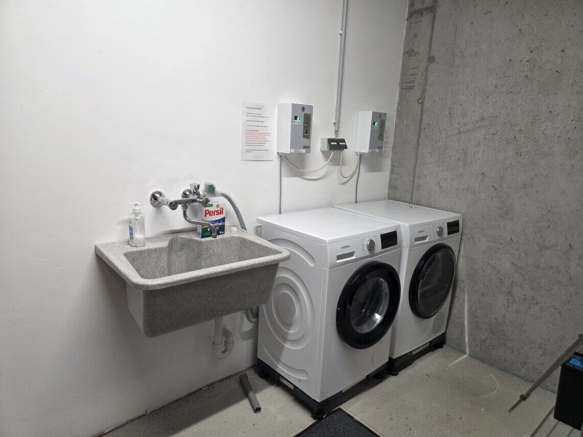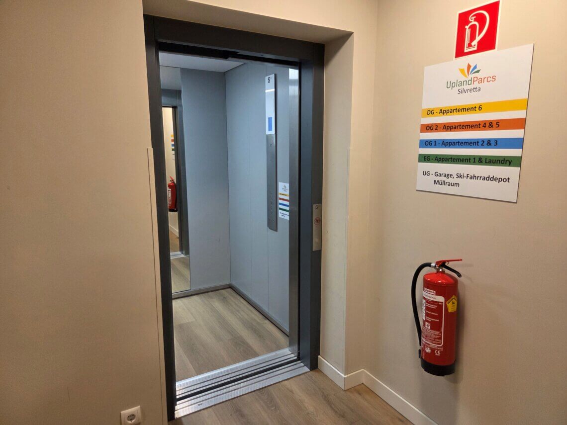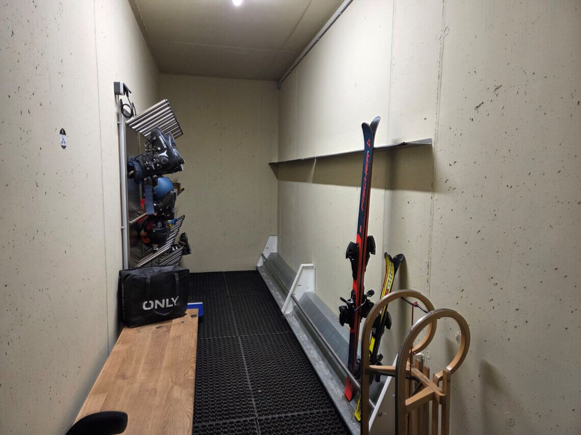 Vanuit de parkeergarage lopen we zo het complex binnen. Via de trap, maar er is hier ook een lift. Wel zo prettig met alle bagage. Ook bevindt zich in de parkeergarage de ruimte met de vuilcontainers en een ruimte met verwarmde skiberging. In de zomer is deze te gebruiken als fietsenstalling. Op de begane grond is een ruimte waar je gebruik kunt maken van een wasmachine en droger tegen betaling van 2 euro per apparaat en voor maximaal 2 uur per programma.