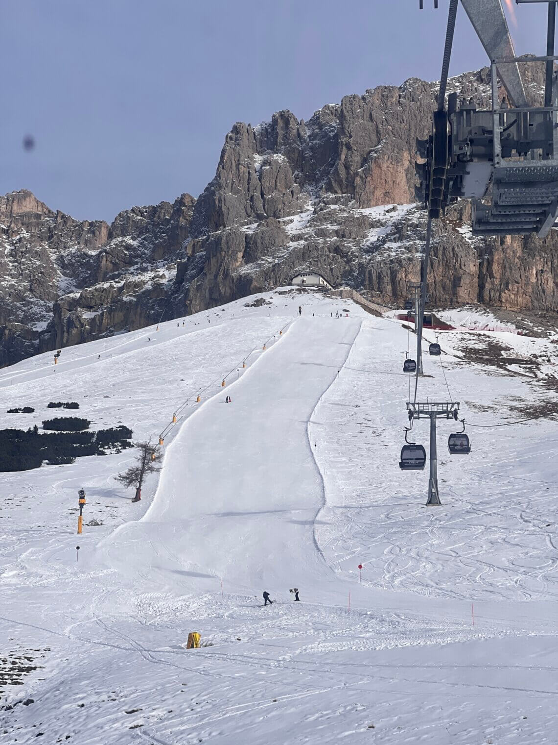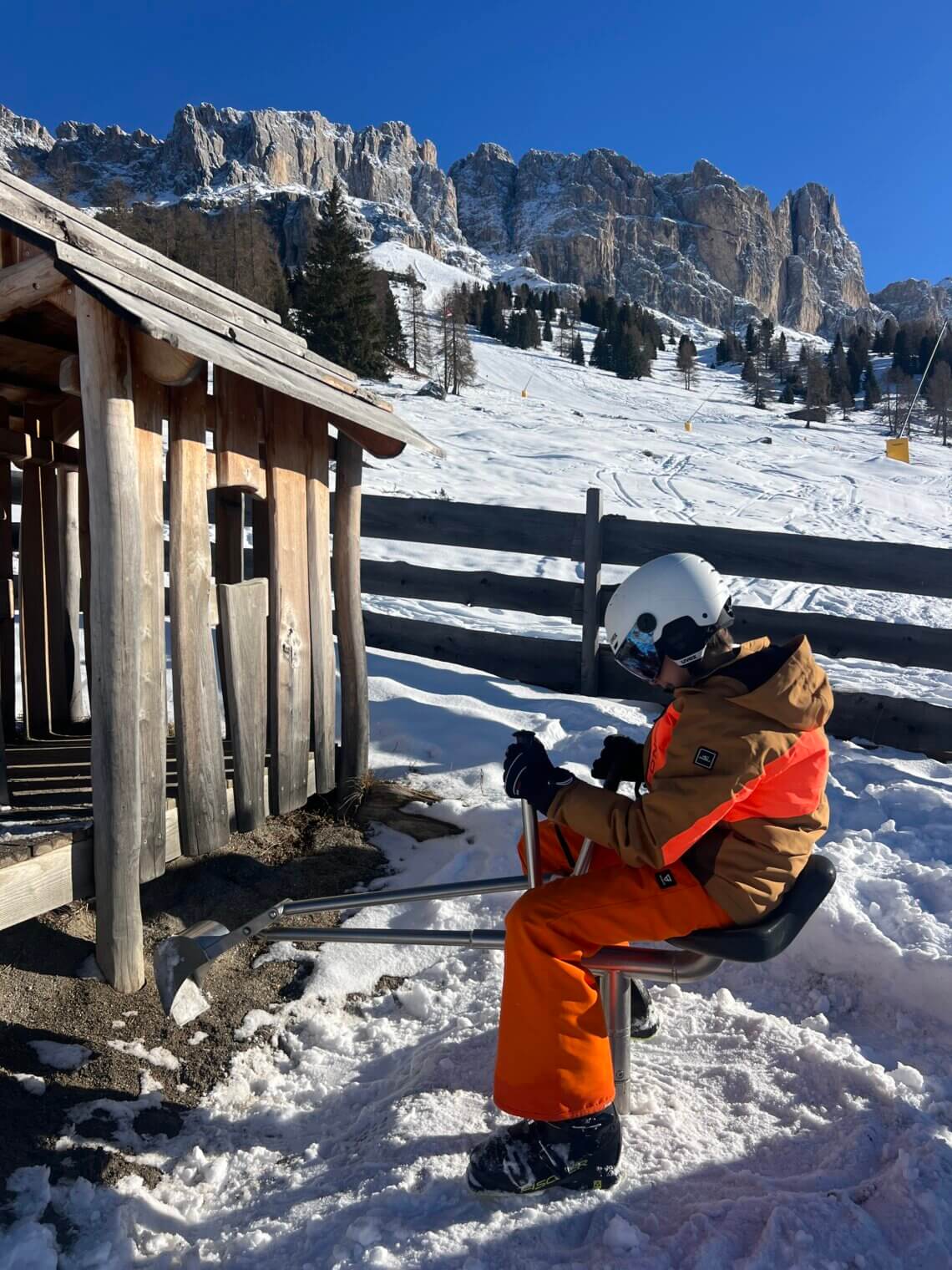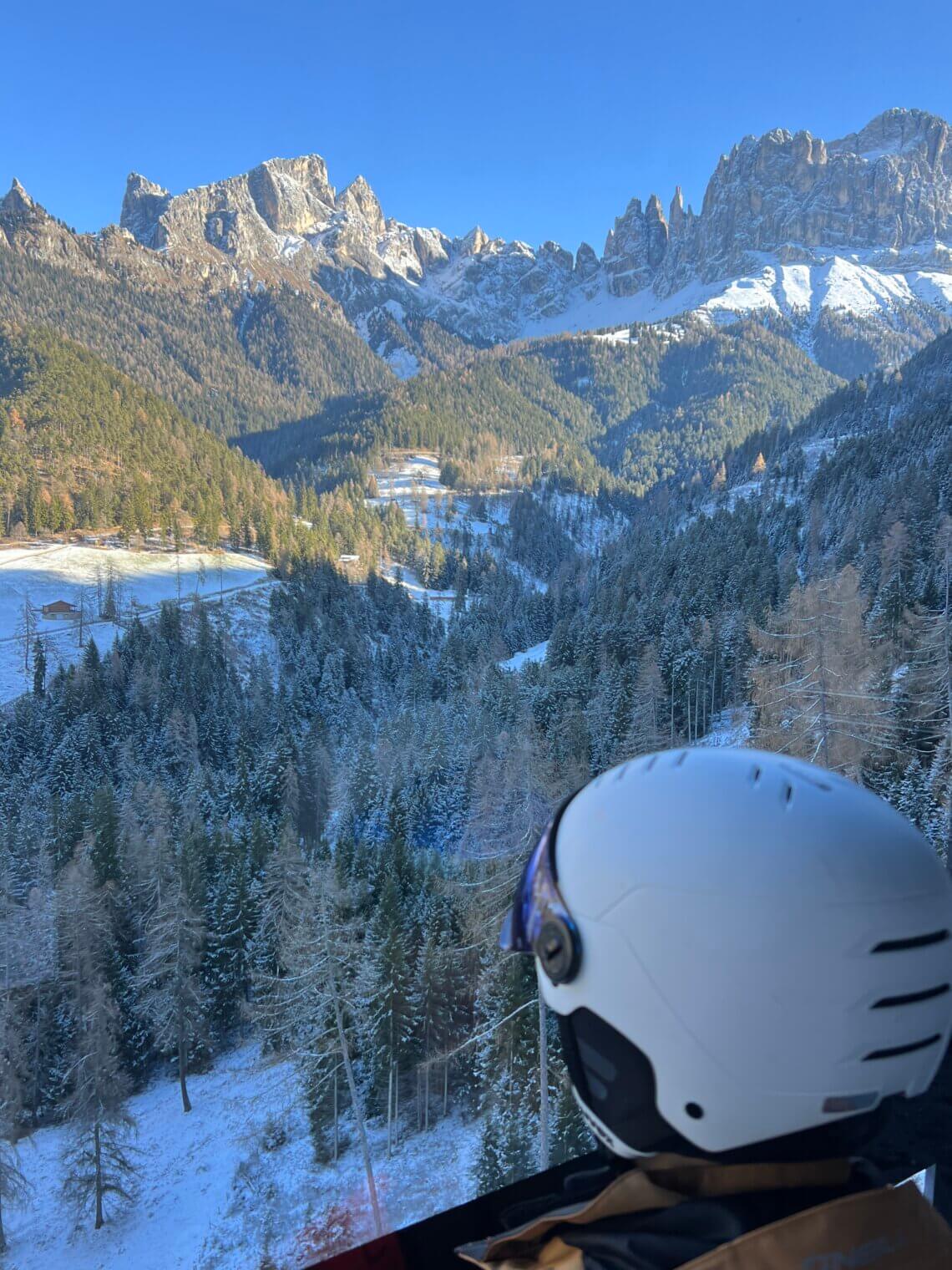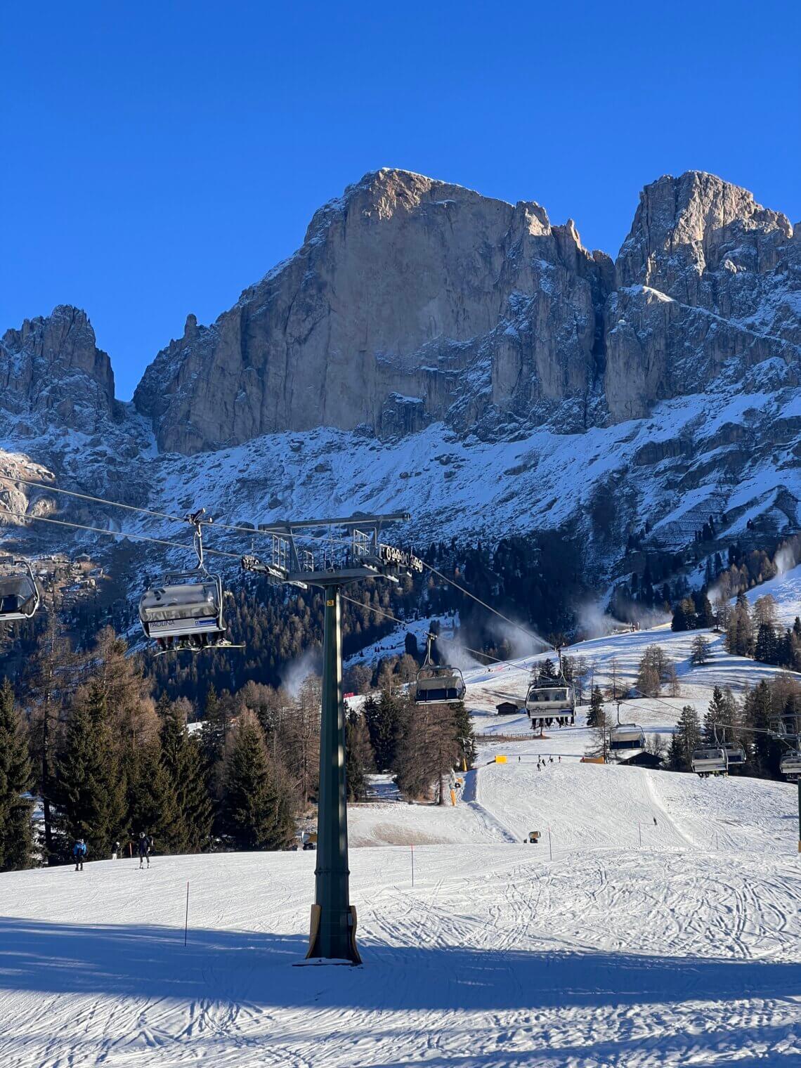 Vanaf de Moseralm nemen we de 404 Tschein-stoeltjeslift weer omhoog. Onder ons zien we de lange blauwe afdaling, die ook perfect is voor beginners en kids. Hier zit ook het snowpark, maar dat is nog niet geopend als wij er zijn. En voor ons… waanzinnig uitzicht op het Rosengarten-massief.