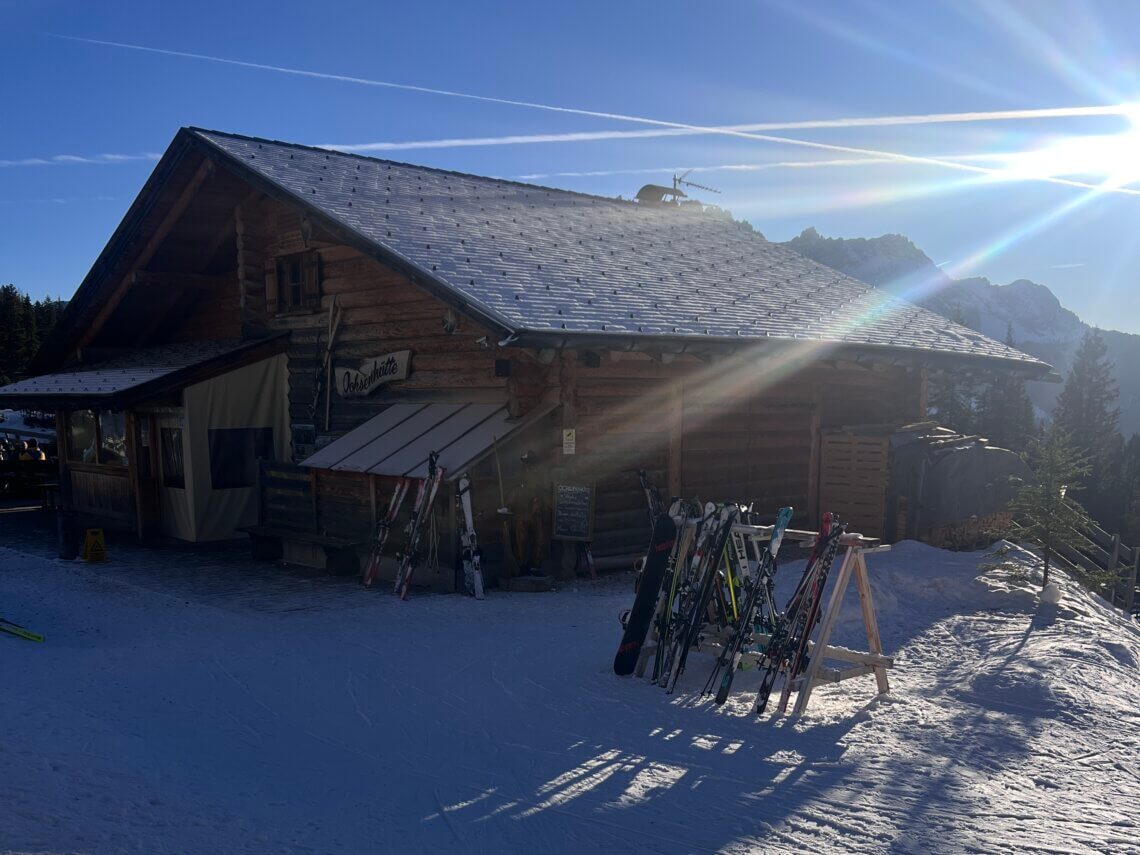 De blauwe 30 is een perfecte piste voor beginners. Vooral het laatste stuk is mooi breed en halverwege zit nog een leuke berghut met speeltuin: de Ochsenhütte. Onderaan nemen we de 404 weer omhoog.