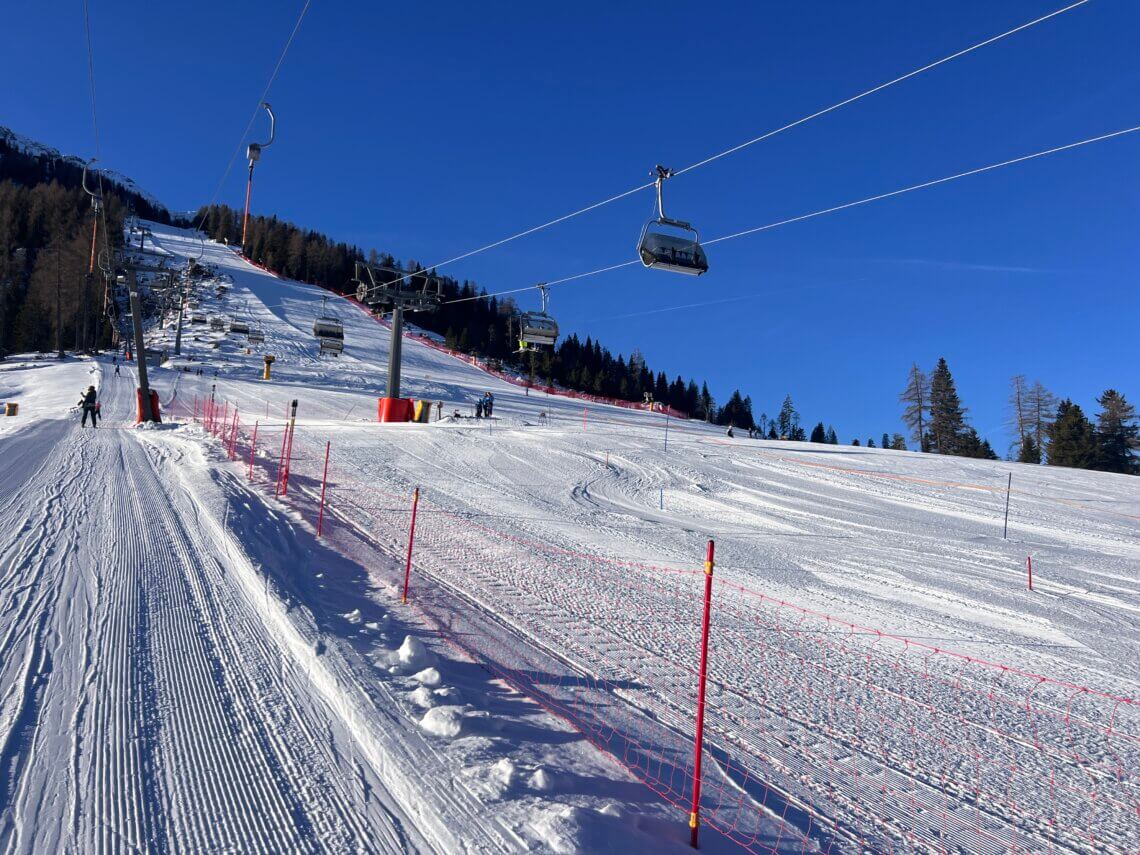 Met onze ski’s onder de arm lopen we naar de skipiste; we starten bij Antermont op 1.745 m. Hier zit een skischool, skiverhuur en ook een kinderland. Al een klein beetje gevorderd? Dan kun je hier de sleeplift nemen voor een eerste afdaling. Wij nemen meteen de stoeltjeslift 414 Pra di Tori naar de top. Terwijl ik met onze dochter de rode afdaling neem, kiezen de ‘mannen’ voor de zwarte piste, die er ook perfect bij ligt.