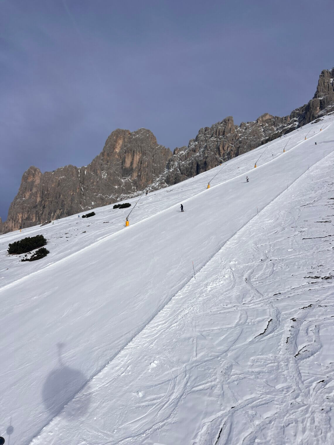 Tip: Wij namen de zwarte afdaling naar de Messnerjoch, maar bij het bergstation van de König Laurin I gaat ook een blauw pad (22A) naar deze berghut. Vanaf het bergstation ga je iets naar beneden en kun je rechts het pad inslaan. Ga je met kids of minder ervaren skiërs, dan kun je op die manier ook deze hut bereiken. Houd er wel rekening mee dat de afdaling vanaf de hut een rode piste is (maar niet heel moeilijk).