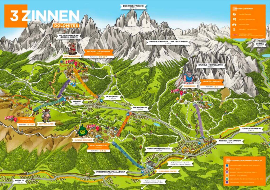 De Dolomietenregio 3 Zinnen staat verder bekend om haar adembenemende natuur en dat is niet voor niets. Delen van de regio, waaronder de iconische 3 bergpieken, zijn sinds 2009 onderdeel van het UNESCO-werelderfgoed. Maar bovenal staat de regio bekend als een topbestemming voor gezinnen met haar vele speel- en avonturenparken op de bergen. Hieronder zie je op de kaart al een overzicht, verderop in dit blog meer daarover.