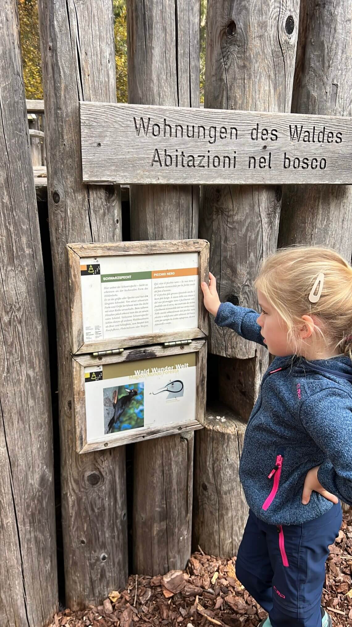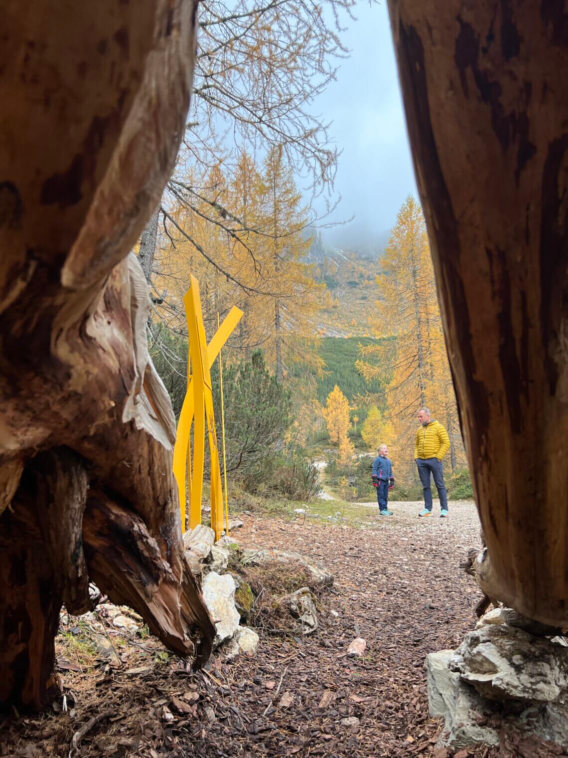 Na onze stop bij het Lago di Dobbiaco komen we nagenoeg langs de volgende spot: Wood Wonder World. We moesten even zoeken, want het Wood Wonder World ligt een beetje verstopt in het bos. Het voordeel is dat we er tijdens ons bezoek niemand tegen kwamen. We parkeren bij de jeugdherberg in Dobbiaco waar we via een bospad richting het Wood Wonder World lopen. Na zo’n 5 minuten lopen treffen we de Wood Wonder World.