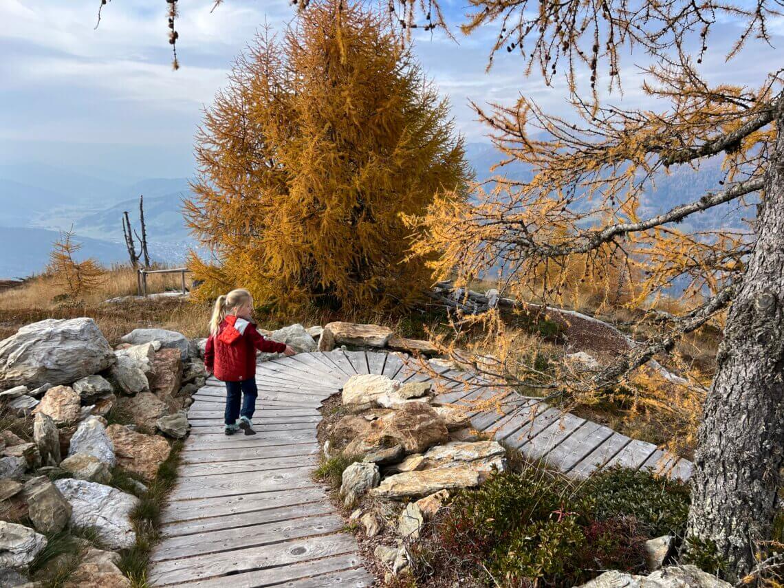 Het fijne is dat dit pad begint en eindigt bij het bergstation en ook toegankelijk is voor buggy’s. Het pad is aangelegd met fijn grind en heeft een hoogteverschil van slechts 90 meter. Liever wat meer hoogtemeters? Dan kan! Je kan eenvoudig van het pad afwijken om een lekker stukje omhoog te klimmen via een uitdagender pad of je route verlengen. Zo gaan wij bij het verste punt van de wandeling nog een extra stukje omhoog zodat we prachtig uitzicht hebben over de kleurrijke bomen onder ons.