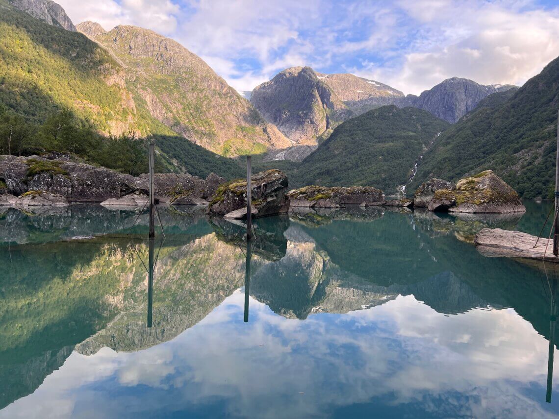 Vanaf deze camping wandelden we ’s middags laat naar het Bondhusvatnet, een prachtig meer. Het pad is heuvelachtig (heenweg steeds stijgen) en goed te bewandelen. Vanaf het meer heb je zicht op een stuk van de Bondhusbreen. Deze gletsjer is wel flink opgetrokken door het opwarmende klimaat. Je kunt een stukje langs het meer wandelen en je loopt heen en terug langs een rivier.