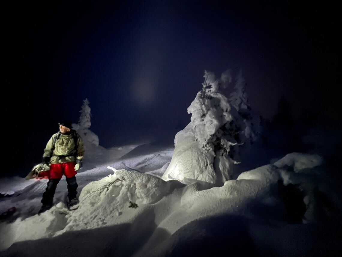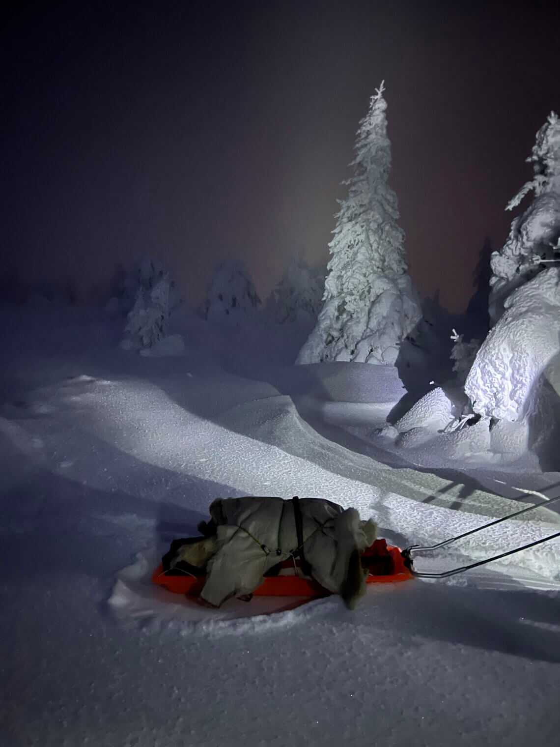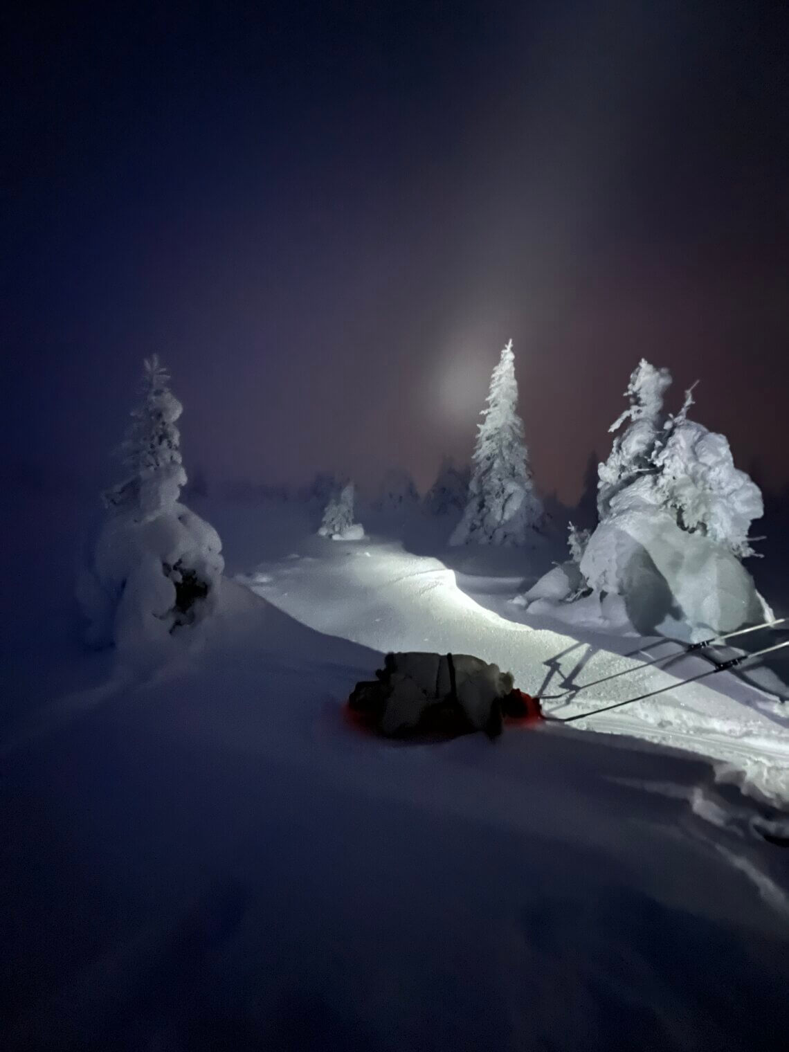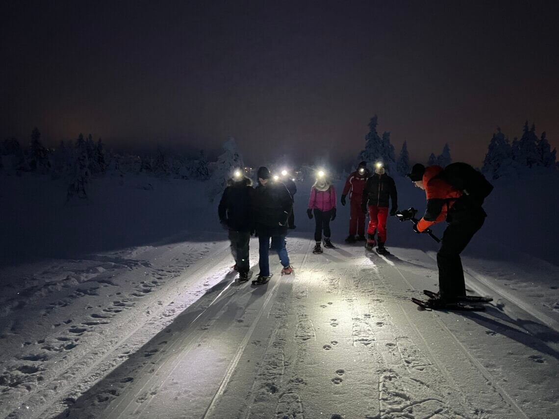 Helaas heb ik niet genoeg tijd om alles te doen, maar ik ga wel mee met een nachtelijke wandeling op sneeuwschoenen — magisch! Met onze sneeuwschoenen lopen we zo’n half uurtje over de knisperende sneeuw. Alles is zo sereen om ons heen, we horen alleen onze eigen voetstappen.
