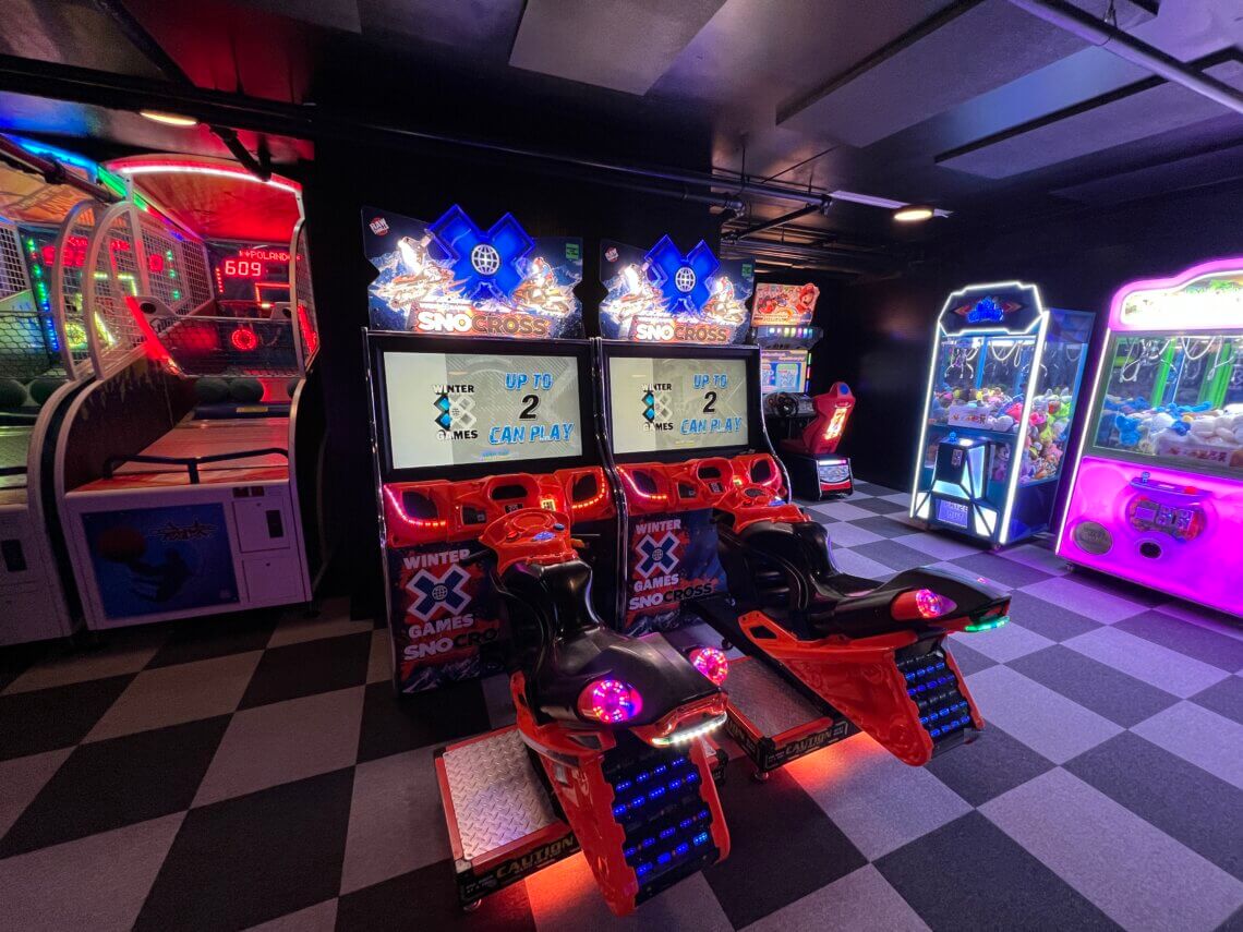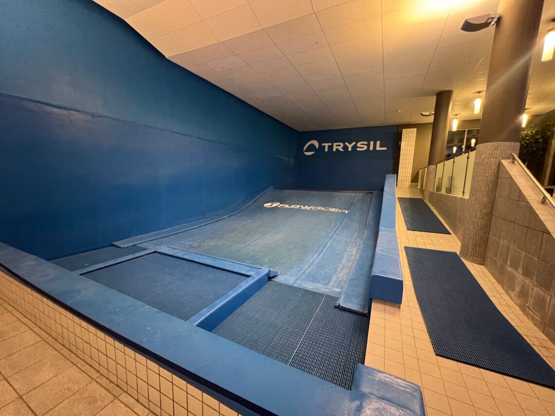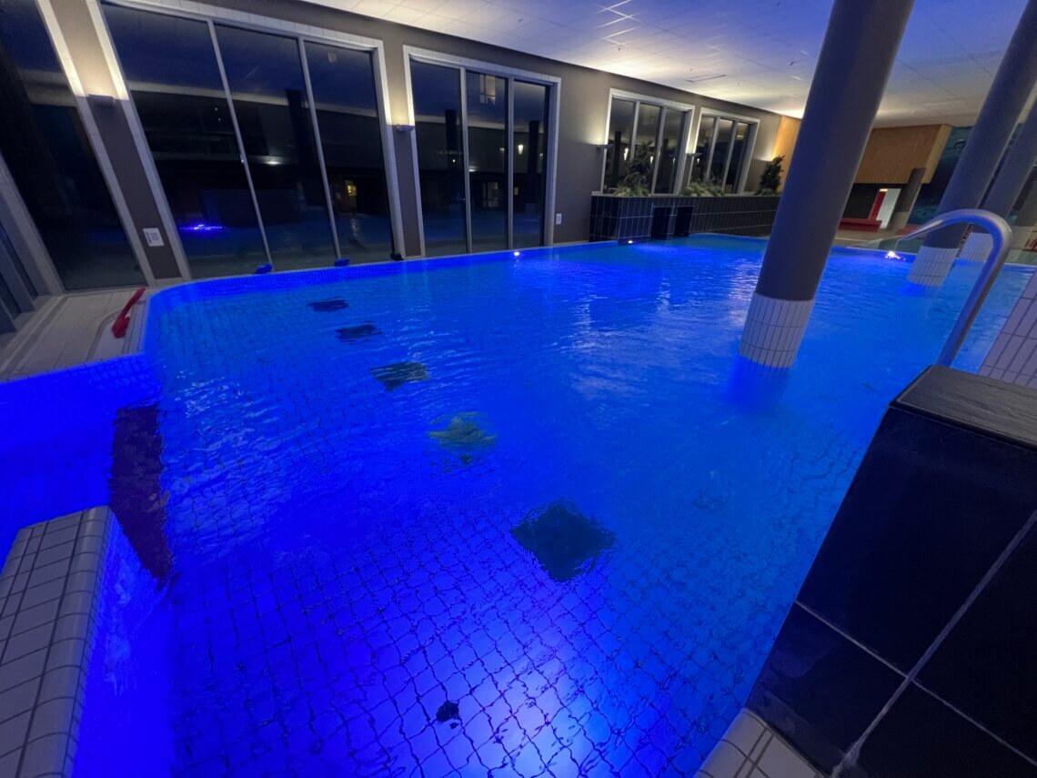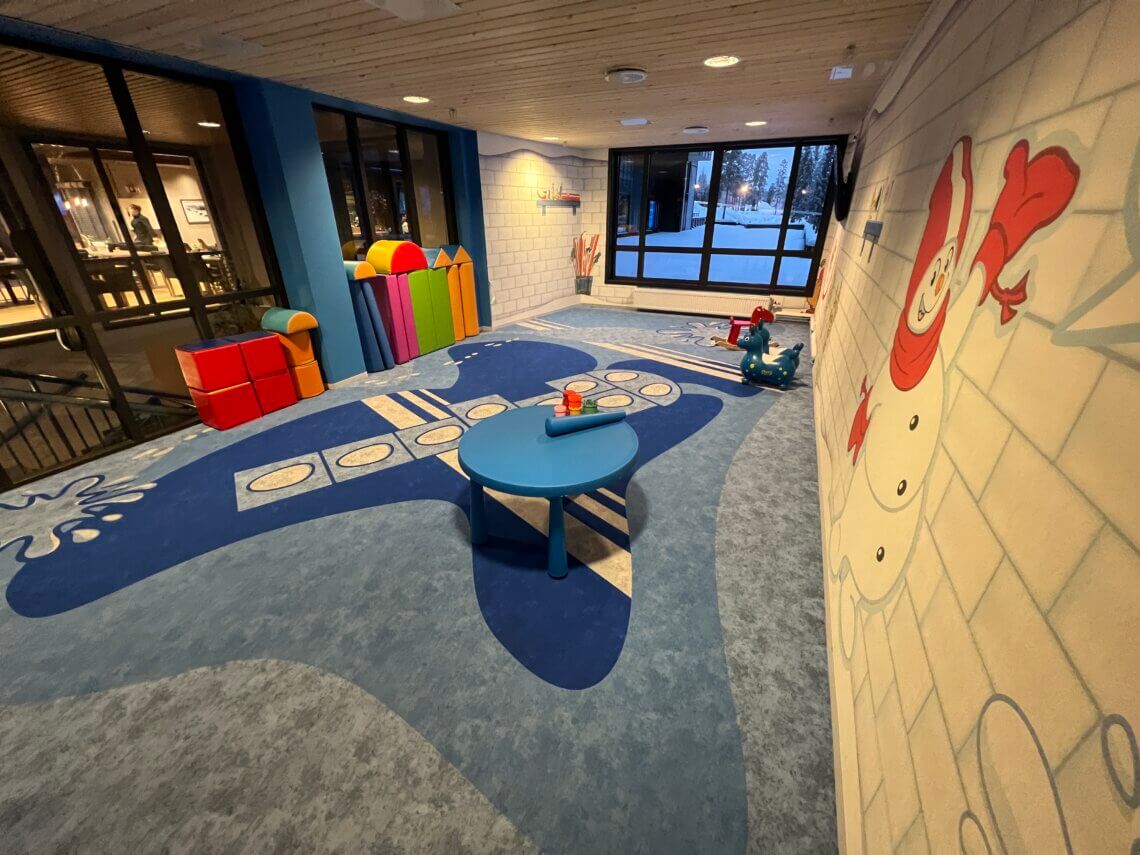 Omdat ik er ben tijdens de kerstperiode, is het hotel prachtig versierd, met een grote kerstboom in de hal. Voor de kinderen is er een aparte speelruimte en een groot binnenzwembad — ideaal voor na het skiën. In het zwembad is zelfs een apart gedeelte waar je kunt leren surfen. Beneden in het hotel is nog een enorme gamehal met bowling- en biljartbanen.
