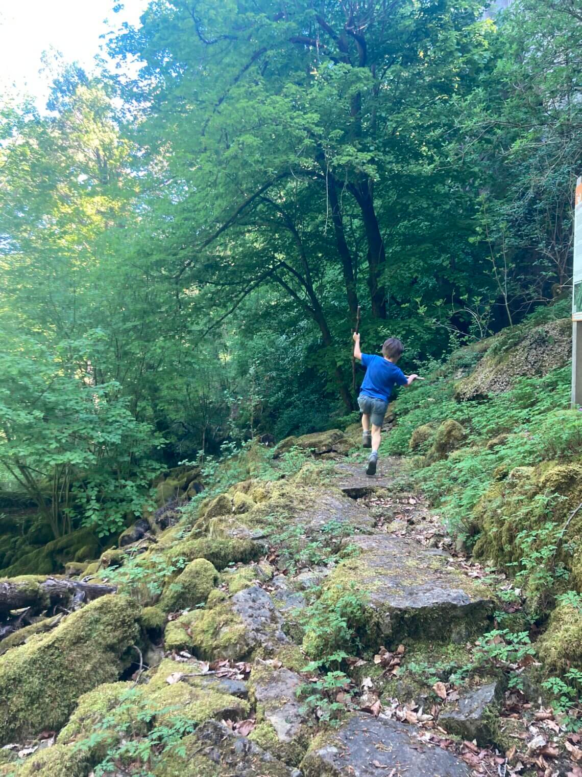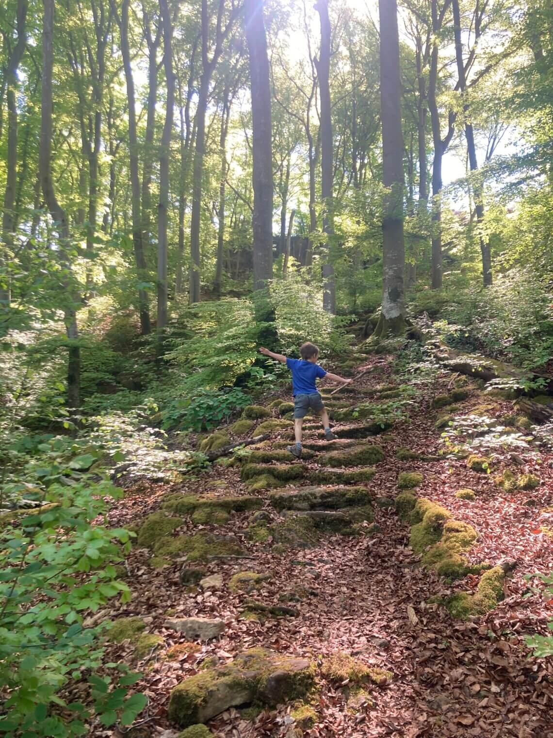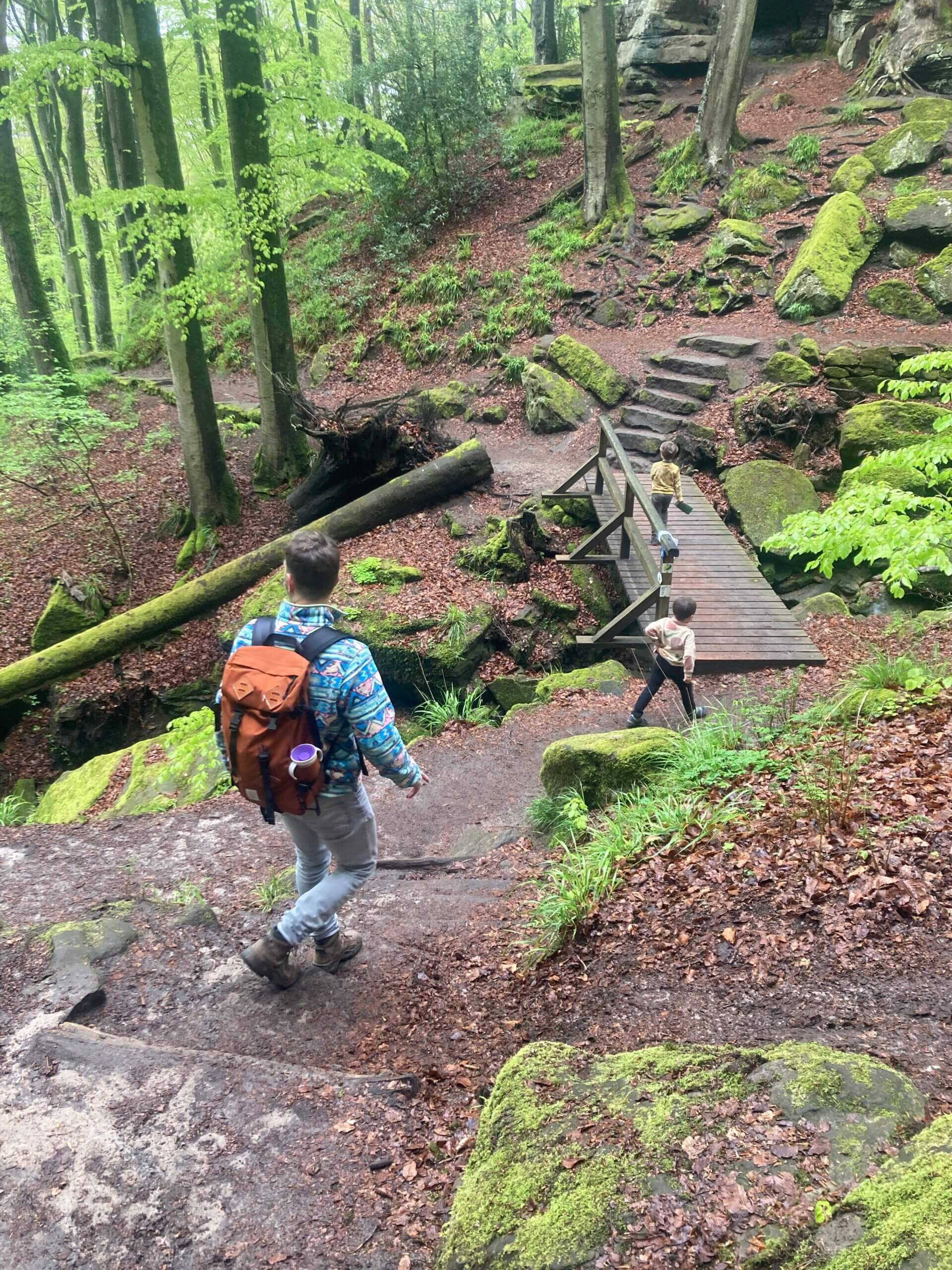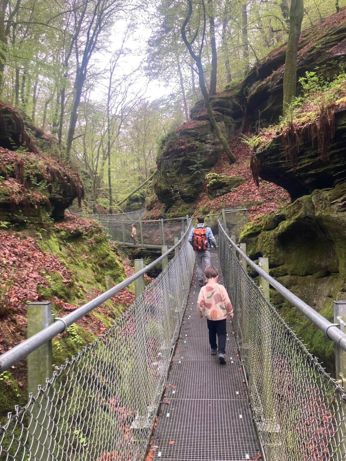 Camping Martbusch ligt net buiten het centrum van Berdorf, en pal naast de plaatselijke VVV, waar de medewerkers uitstekende (kindvriendelijke!) tips kunnen geven. Als we op onze eerste ochtend die bewuste VVV aandoen, heb ik een VVV-medewerker nog zelden zo resoluut horen zeggen welke route we echt, maar dan ook écht, op onze 1e dag in het Mullerthal moeten wandelen: ‘Route B2, die moet je hebben!’. Extra fijn dat deze direct vanuit camping Martbusch vertrekt, maar geloof me, anders wil je er ook even voor in de auto zitten (bij de VVV is een groot parkeerplaats). Route B2 is iets langer dan 4 km, en dat klinkt kort, maar het zijn allesbehalve vier vlakke kilometers. Alle indrukken die je van deze regio kan opdoen, zitten verpakt in deze ene route: grotten, loopbruggen, rotswanden, smalle spleten, uitzichtpunten en 101 verschillende tinten groen.