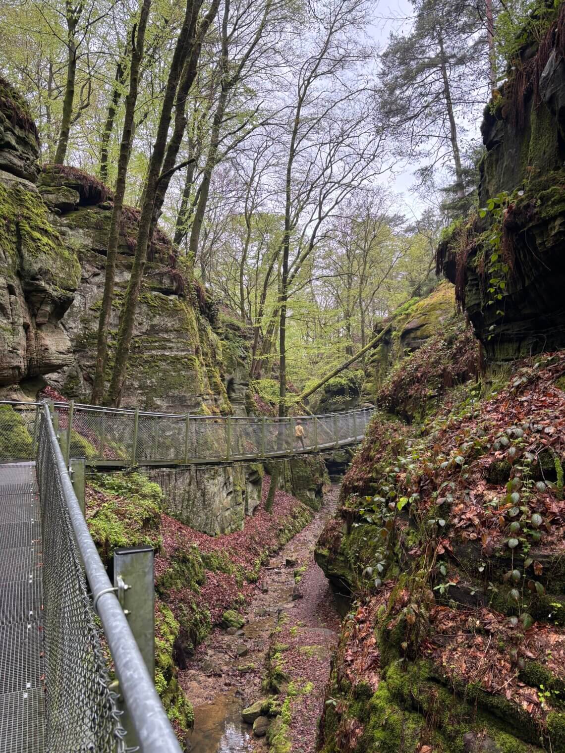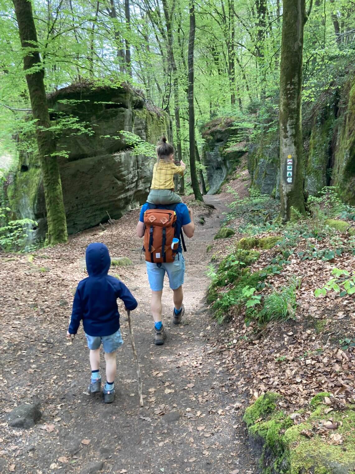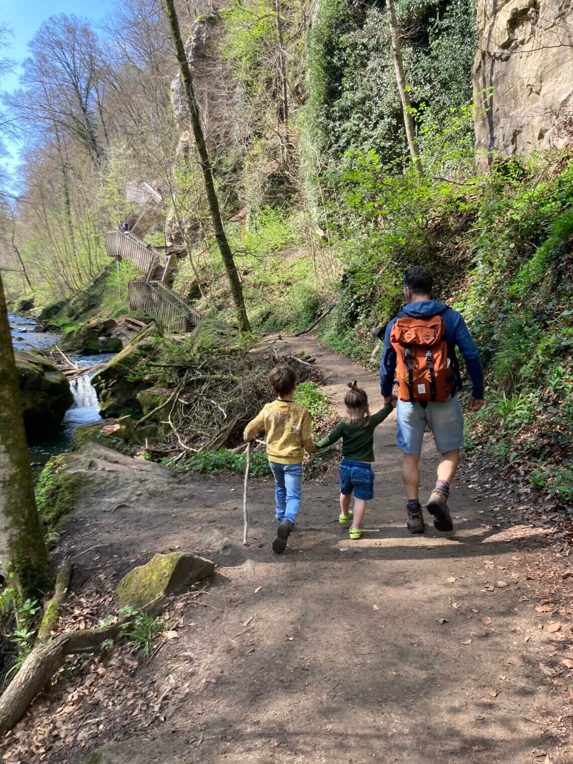 Camping Martbusch ligt net buiten het centrum van Berdorf, en pal naast de plaatselijke VVV, waar de medewerkers uitstekende (kindvriendelijke!) tips kunnen geven. Als we op onze eerste ochtend die bewuste VVV aandoen, heb ik een VVV-medewerker nog zelden zo resoluut horen zeggen welke route we echt, maar dan ook écht, op onze 1e dag in het Mullerthal moeten wandelen: ‘Route B2, die moet je hebben!’. Extra fijn dat deze direct vanuit camping Martbusch vertrekt, maar geloof me, anders wil je er ook even voor in de auto zitten (bij de VVV is een groot parkeerplaats). Route B2 is iets langer dan 4 km, en dat klinkt kort, maar het zijn allesbehalve vier vlakke kilometers. Alle indrukken die je van deze regio kan opdoen, zitten verpakt in deze ene route: grotten, loopbruggen, rotswanden, smalle spleten, uitzichtpunten en 101 verschillende tinten groen.