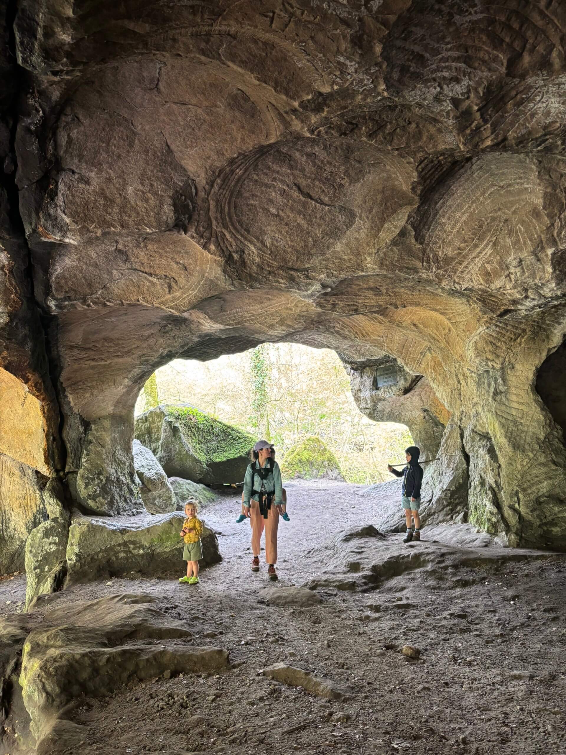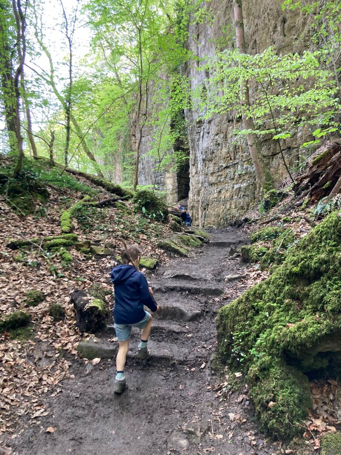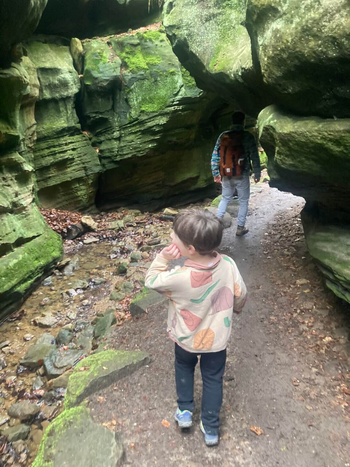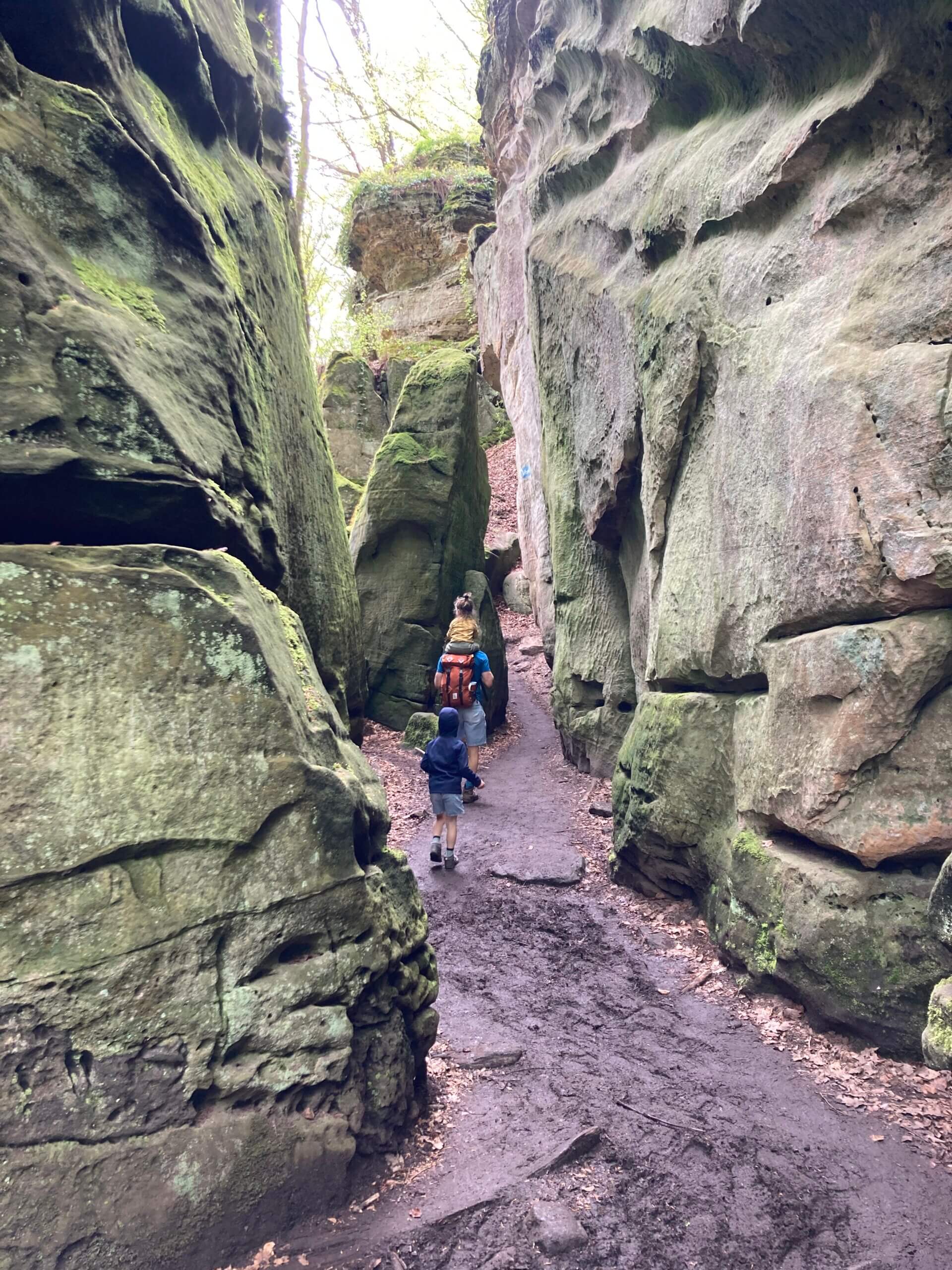 Camping Martbusch ligt net buiten het centrum van Berdorf, en pal naast de plaatselijke VVV, waar de medewerkers uitstekende (kindvriendelijke!) tips kunnen geven. Als we op onze eerste ochtend die bewuste VVV aandoen, heb ik een VVV-medewerker nog zelden zo resoluut horen zeggen welke route we echt, maar dan ook écht, op onze 1e dag in het Mullerthal moeten wandelen: ‘Route B2, die moet je hebben!’. Extra fijn dat deze direct vanuit camping Martbusch vertrekt, maar geloof me, anders wil je er ook even voor in de auto zitten (bij de VVV is een groot parkeerplaats). Route B2 is iets langer dan 4 km, en dat klinkt kort, maar het zijn allesbehalve vier vlakke kilometers. Alle indrukken die je van deze regio kan opdoen, zitten verpakt in deze ene route: grotten, loopbruggen, rotswanden, smalle spleten, uitzichtpunten en 101 verschillende tinten groen.