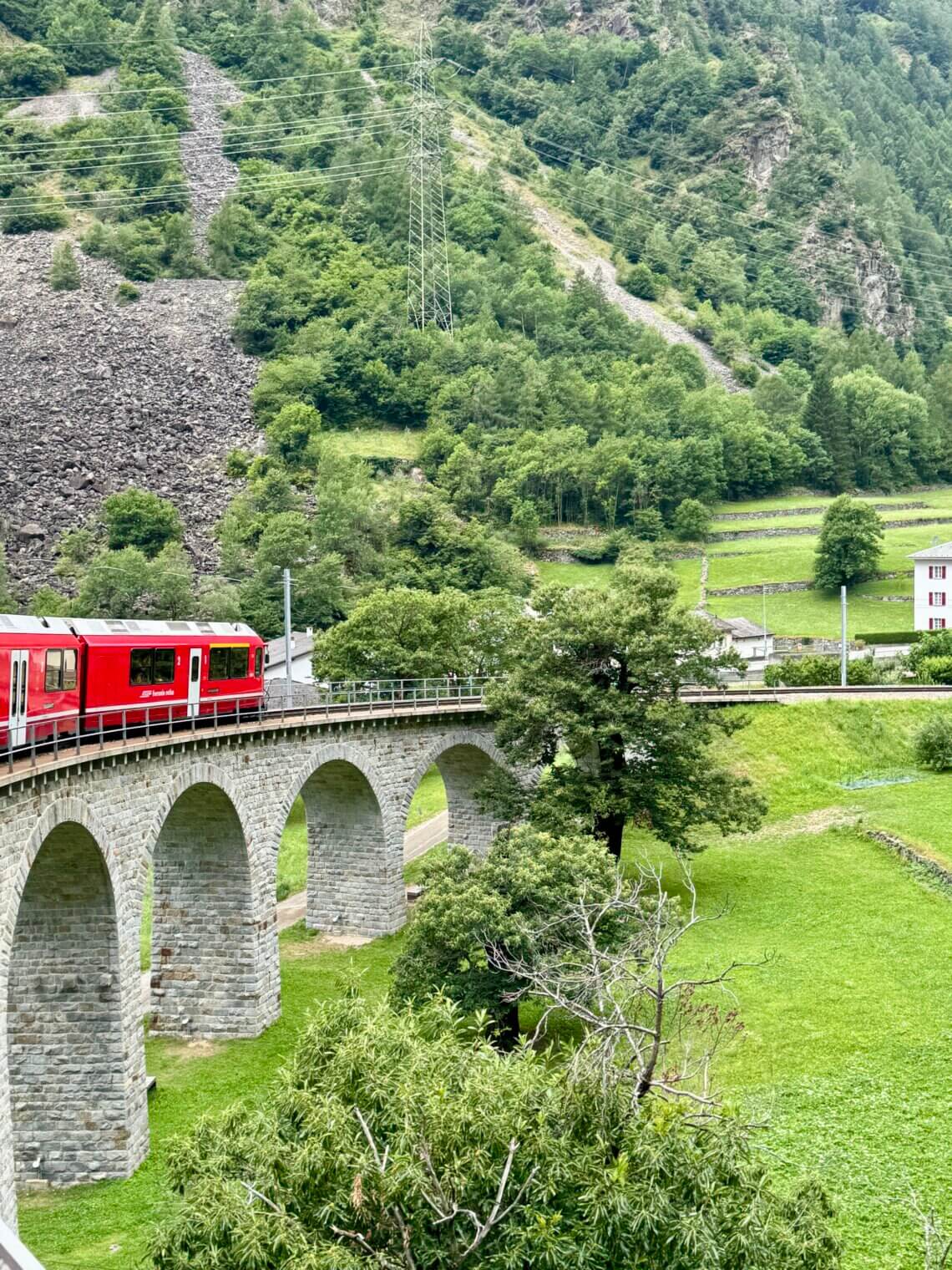 Het is nog aardig rustig in de trein. Met de populariteit had ik massa’s mensen verwacht, maar dat valt mee. Wel zie je dat het een toeristisch uitstapje is, maar dat is logisch gelet op de prachtige route. We passeren prachtige uitzichtpunten, maken natuurlijk stopjes om foto’s te maken en steken valleien over via hoge bruggen. Na zo’n 2 uur kom ik in het Italiaanse Tirano uit.