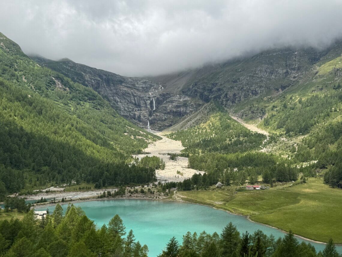 Het lijkt vrij vlak maar ik moet toch flink omhoog fietsen merk ik. Ik fiets evenwijdig aan de blauwe rivier met smeltwater omhoog en passeer koets na koets. Na een tijdje kom ik bij Hotel Restaurant Roseg Gletscher uit. Tijd voor een soepje en pauze. Vanaf hier kan ik nog een stukje fietsen waarna ik deze tegen een rots parkeer en te voet verder ga. Ik start een prachtige wandeling omhoog richting de gletsjer. Dit dal is echt adembenemend en ik baal een beetje dat ik niet het hele stuk omhoog kan lopen. Ik voel de benen een beetje van het lopen en fietsen en met nog een marathon en 2.600 hoogtemeters voor de boeg besluit ik om maar eens verstandig te doen.