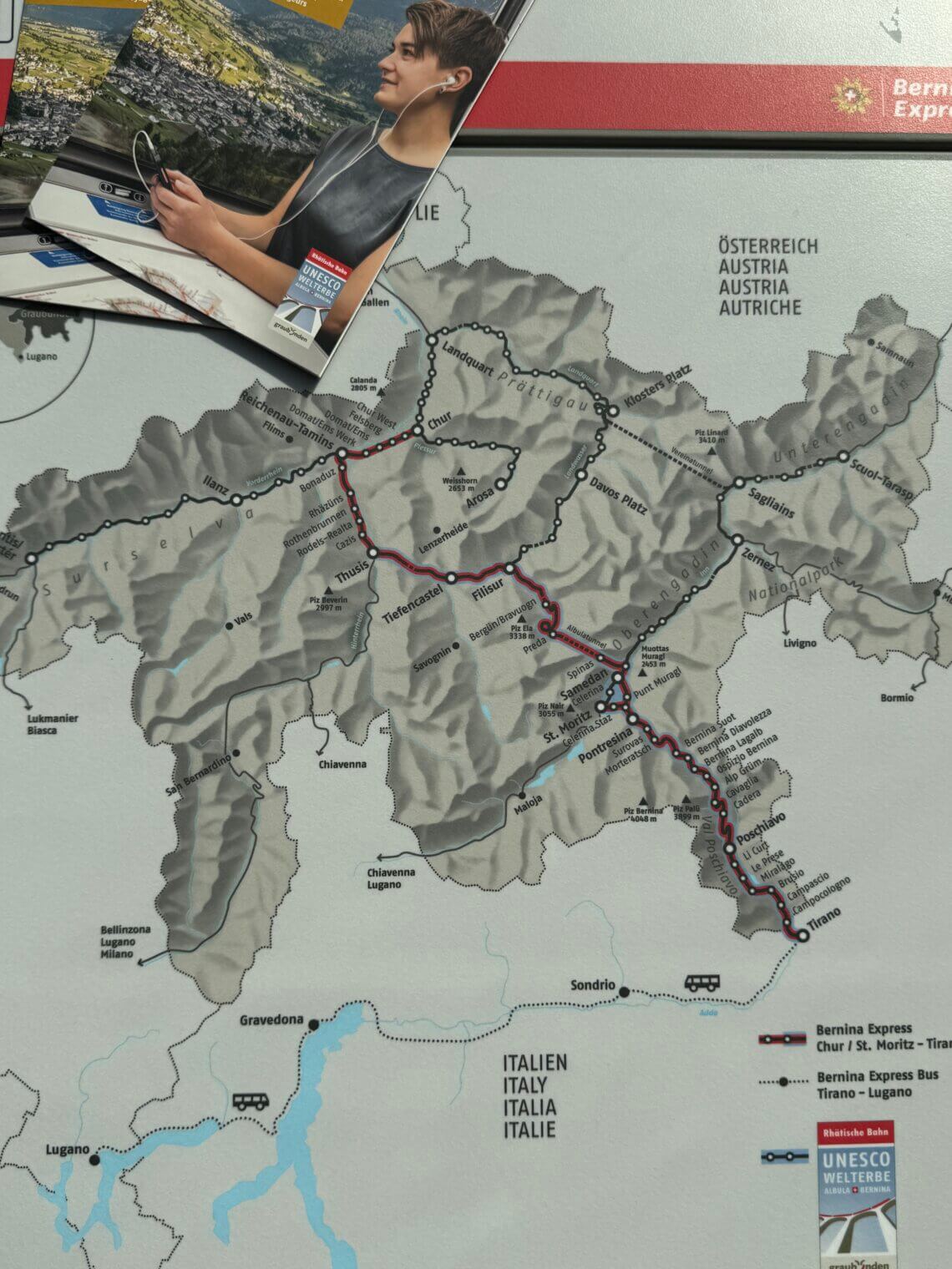 De Bernina Express moet de mooiste treinrit van Zwitserland zijn. Hoewel deze in Chur begint maakt de trein een stop in Pontresina om van hieruit het laatste stuk richting het Italiaanse Tirano. Ik had een dag spierpijn ingecalculeerd en het leek me de ideale combinatie om na een dag door de Alpen rennen heerlijk een uurtje of vier in de trein te zitten. Tijd dus om in te stappen op het station van Pontresina.