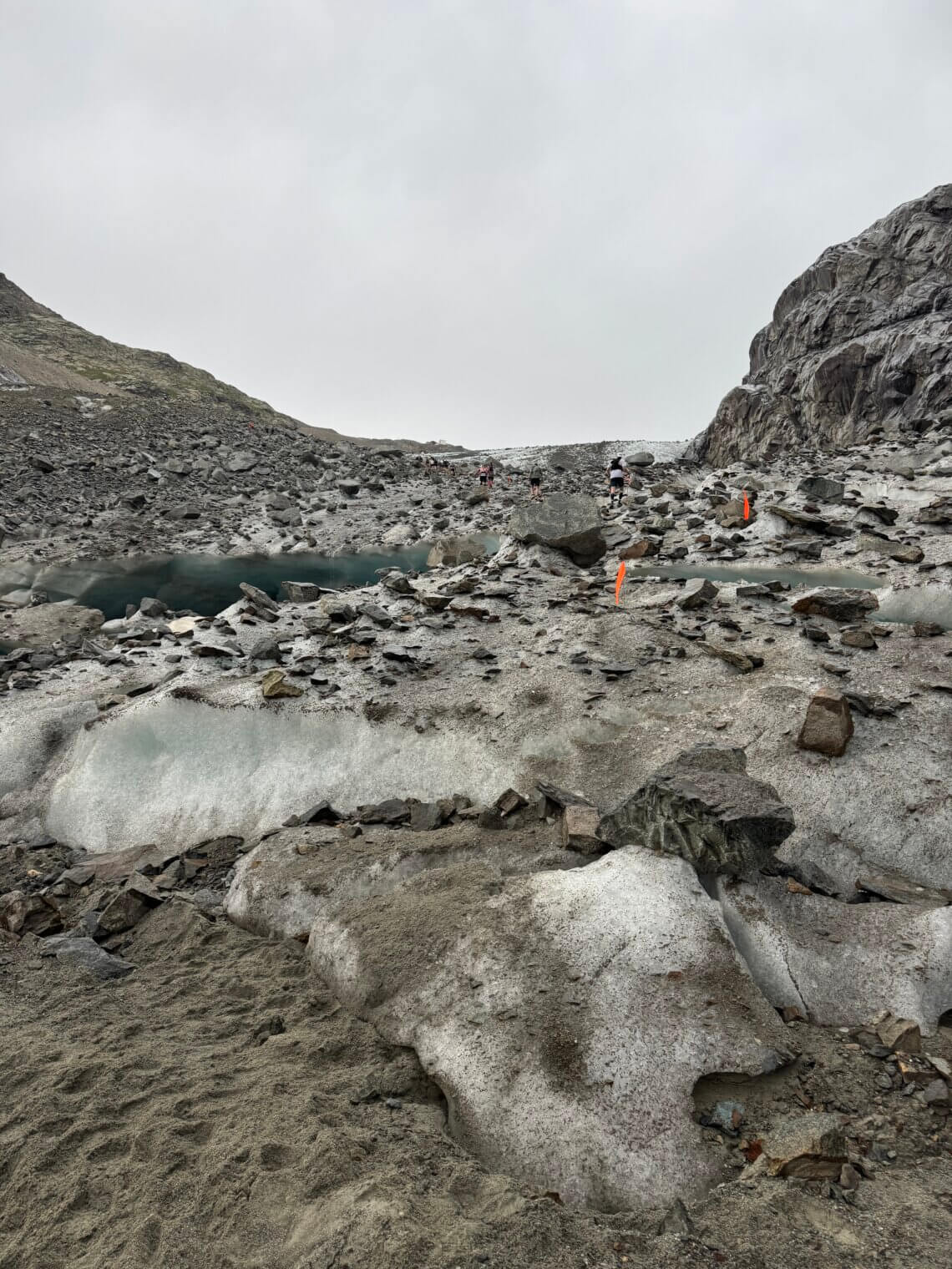 Daarna is het tijd voor een lange afdaling en onderweg mag ik in de (inmiddels) stromende regen een flinke uitglijder, koprol en haal mijn knie open aan de stenen. Gelukkig kan ik wel verder na weer opgelapt te zijn door de EHBO’ers ga ik verder richting Alp Languard. De regen heeft inmiddels plek gemaakt voor de zon en de temperatuur loopt ook snel op. Ik begin de benen nu wel wat te voelen en maak me op voor de laatste klim naar Chamanna Segantini. Vanaf hier is enkel nog afdalen naar het centrum van Pontresina waar ik weer onder de finishboog door mag rennen.
