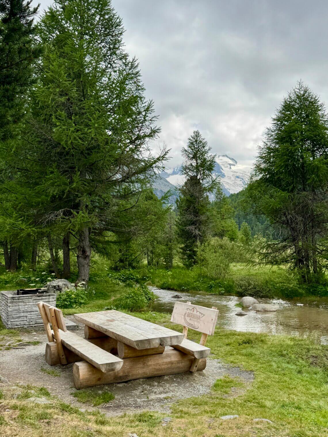 Wanneer ik de camping af fiets en een stukje het dal ik rijd dan zie ik gelijk alweer de bekende Zwitserse grillplaatsen. Deze zijn weer schitterend gelegen, aan het water en met voldoende hout aanwezig om je worstjes te grillen.