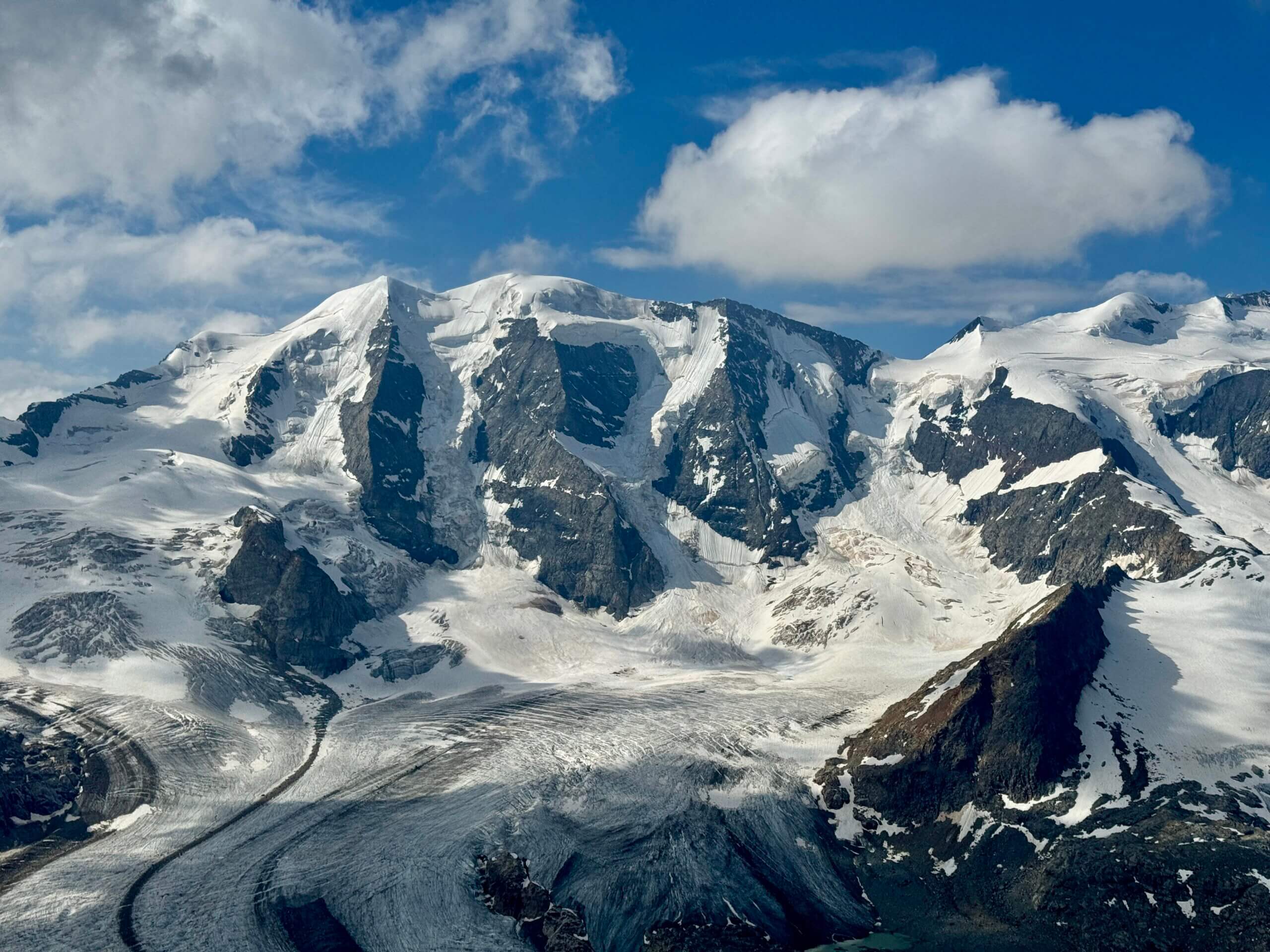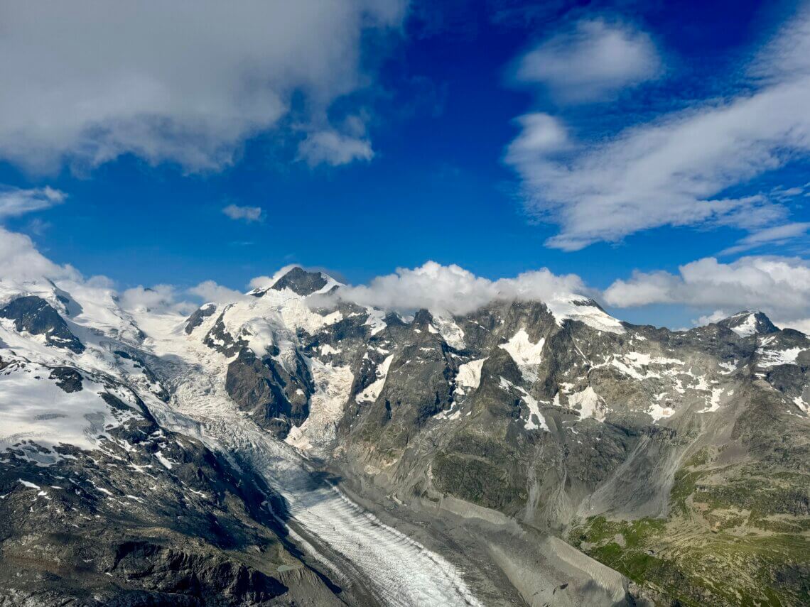 Wanneer ik uit de lift loop kijk ik recht tegen de prachtige gletsjers aan. Ik heb een van de laatste liften (tot 17:00) gepakt waardoor het heerlijk rustig is. Ik blijf nog even staan op het panoramaterras om foto’s te maken van de Persgletsjer en de Morteratschgletsjer die voor me liggen. Het uitzicht is adembenemend mooi en voor mij liggen de meer dan 4.000 hoge Piz Bernina en de Piz Palü. Ik realiseer me dat ik me hier op een indrukwekkende plek begeef.