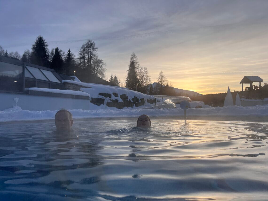 Wanneer we doorlopen van de Wildsee naar Sigis Sauhaufen naar Seefeld komen we bij het Olympiabad uit. Dit enorme zwemparadijs is niet te missen en bestaat uit zowel een zwemparadijs als verschillende sauna’s. Ons vallen meteen de enorme glijbaan en wildwaterbaan, die beiden buitenlangs gaan, op. Hier moeten we naartoe!