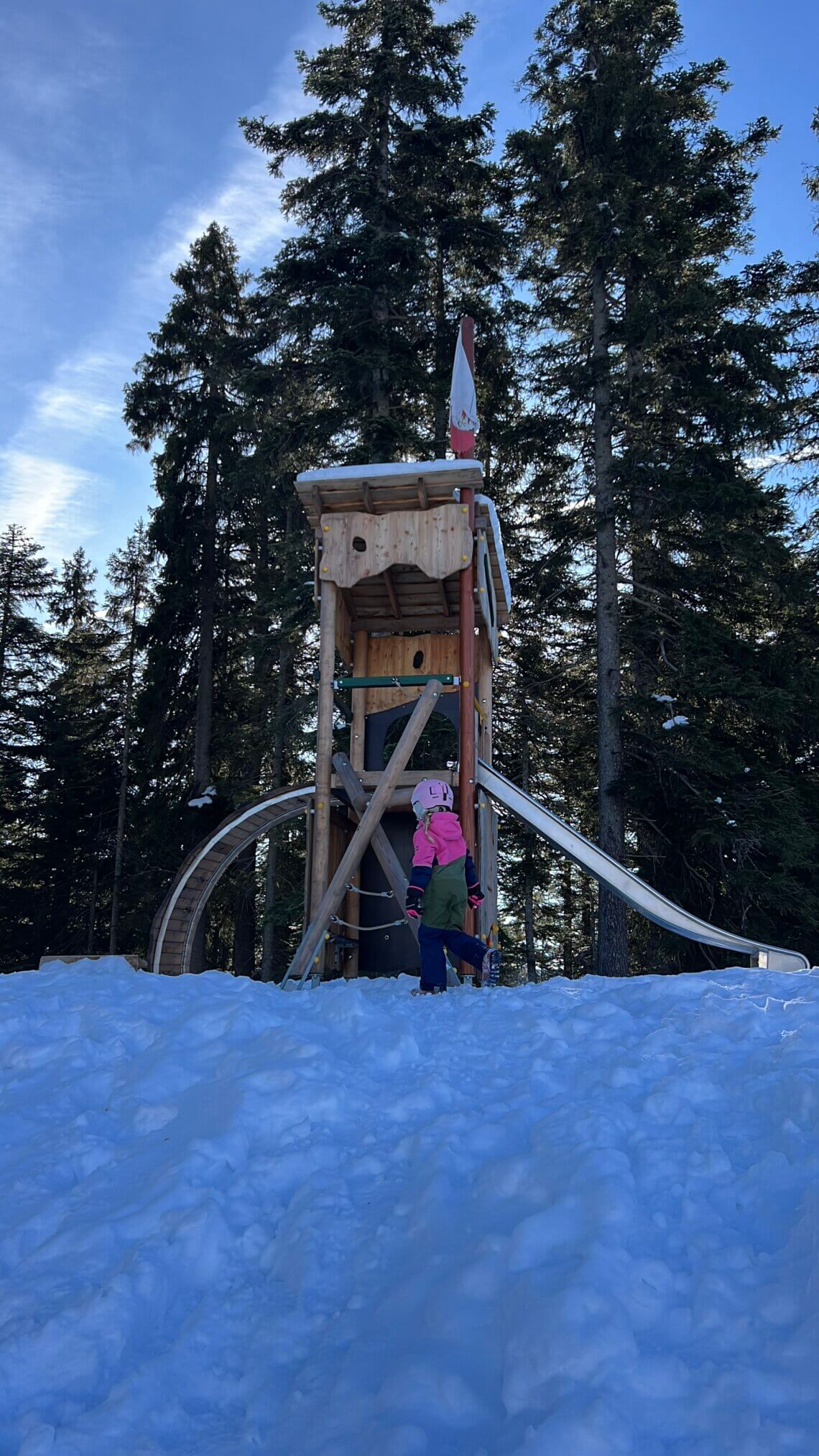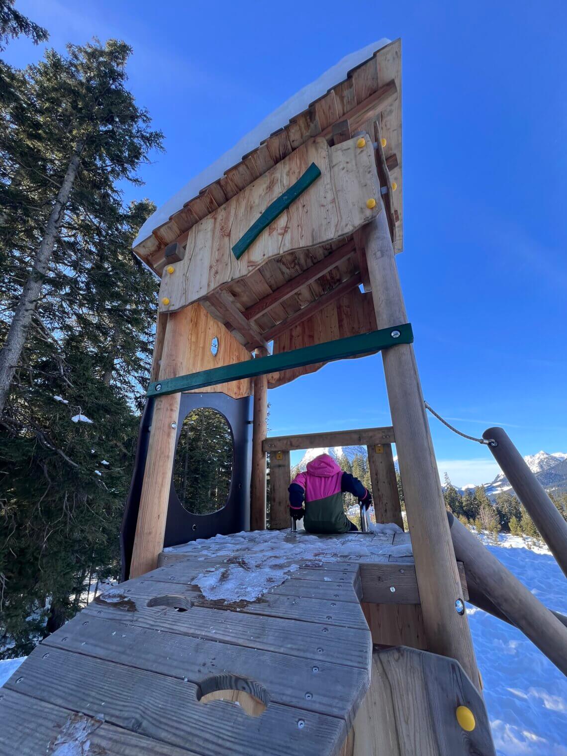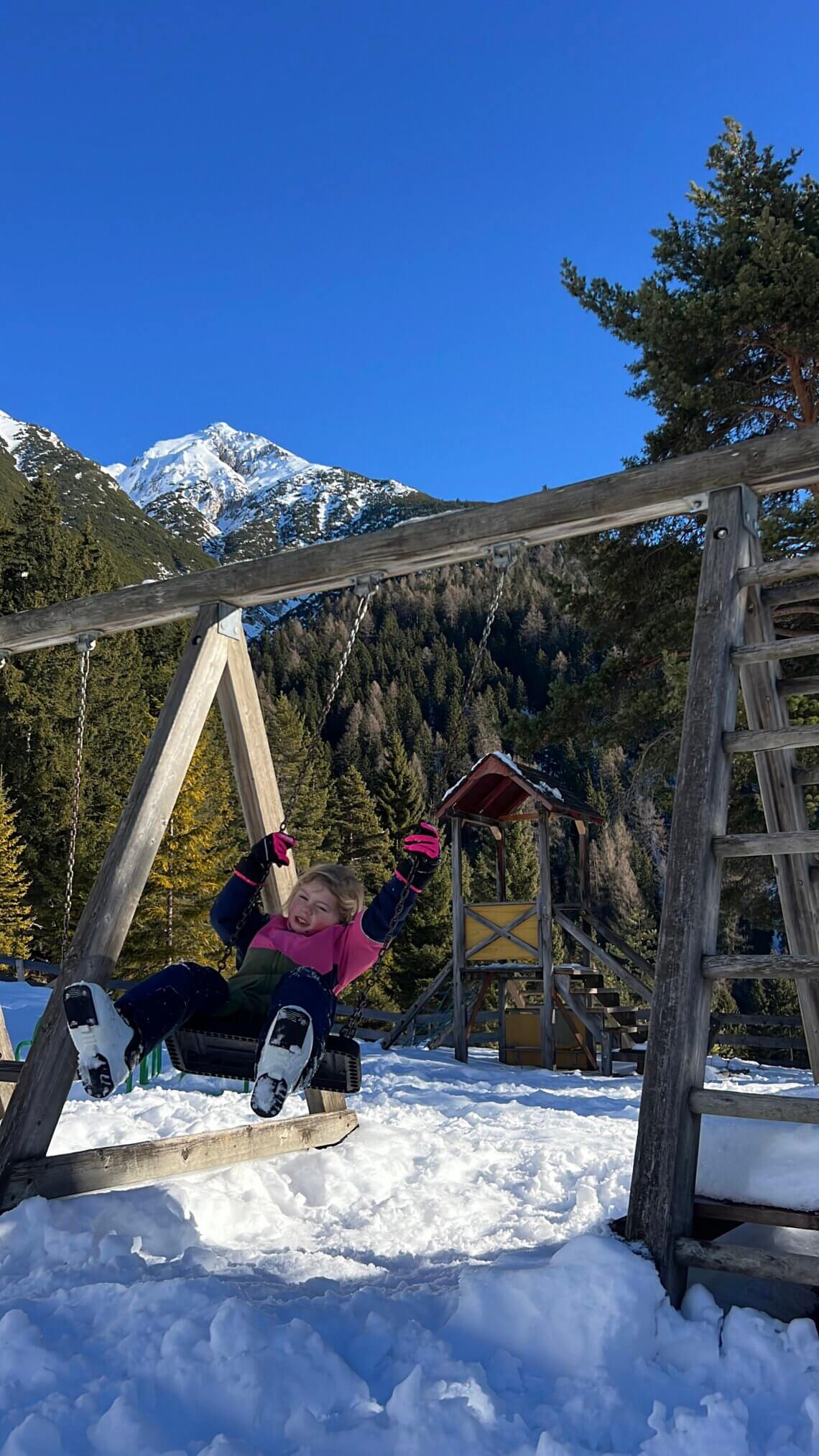 De Reitherjoch Alm is een prachtige plek en heeft een heerlijke speeltuin. We zien skiërs maar ook winterwandelaars, er gaat hier ook een winterwandelweg naar toe. Na een heerlijke Tiroolse lunch gaan we verder en vermaken ons perfect op de pistes. Van een brede pistes tot een mooie daldaling langs de bomen en die funicular.