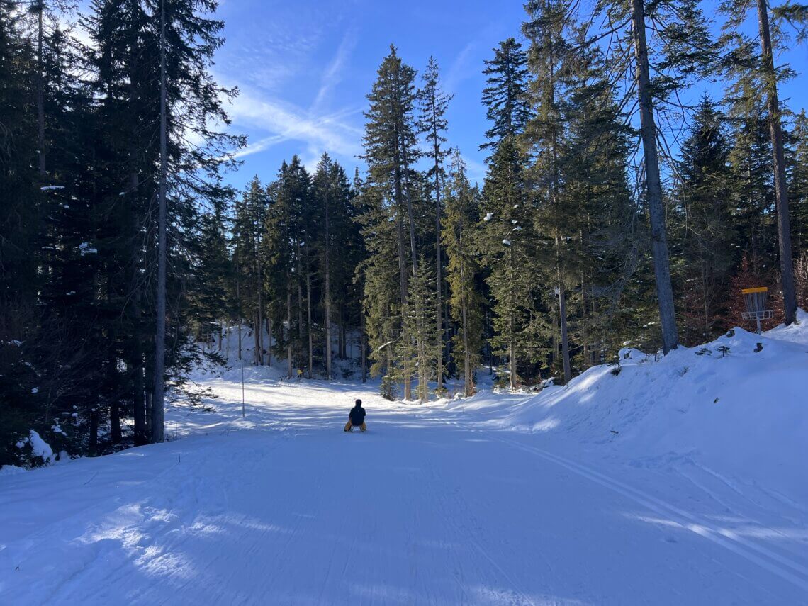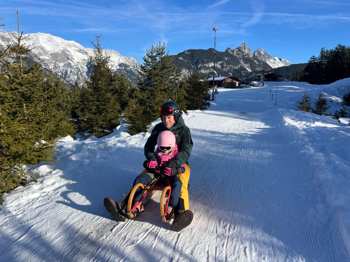 Wat op net wat meer enthousiasme bij onze dochter kan rekenen is rodelen. De volgende dag rijden we in zo’n 10 minuten naar Leutasch en huren hier onze rodelslee. We pakken de stoeltjeslift naar boven en doen een aantal keer de 2,5 kilometer lange afdaling. Deze is niet erg moeilijk en wij vonden hem goed te doen. Bovenaan de lift, waar ook de rodelafdaling begint, ligt de Katzenkopfhütte waar we heerlijk lunchen.