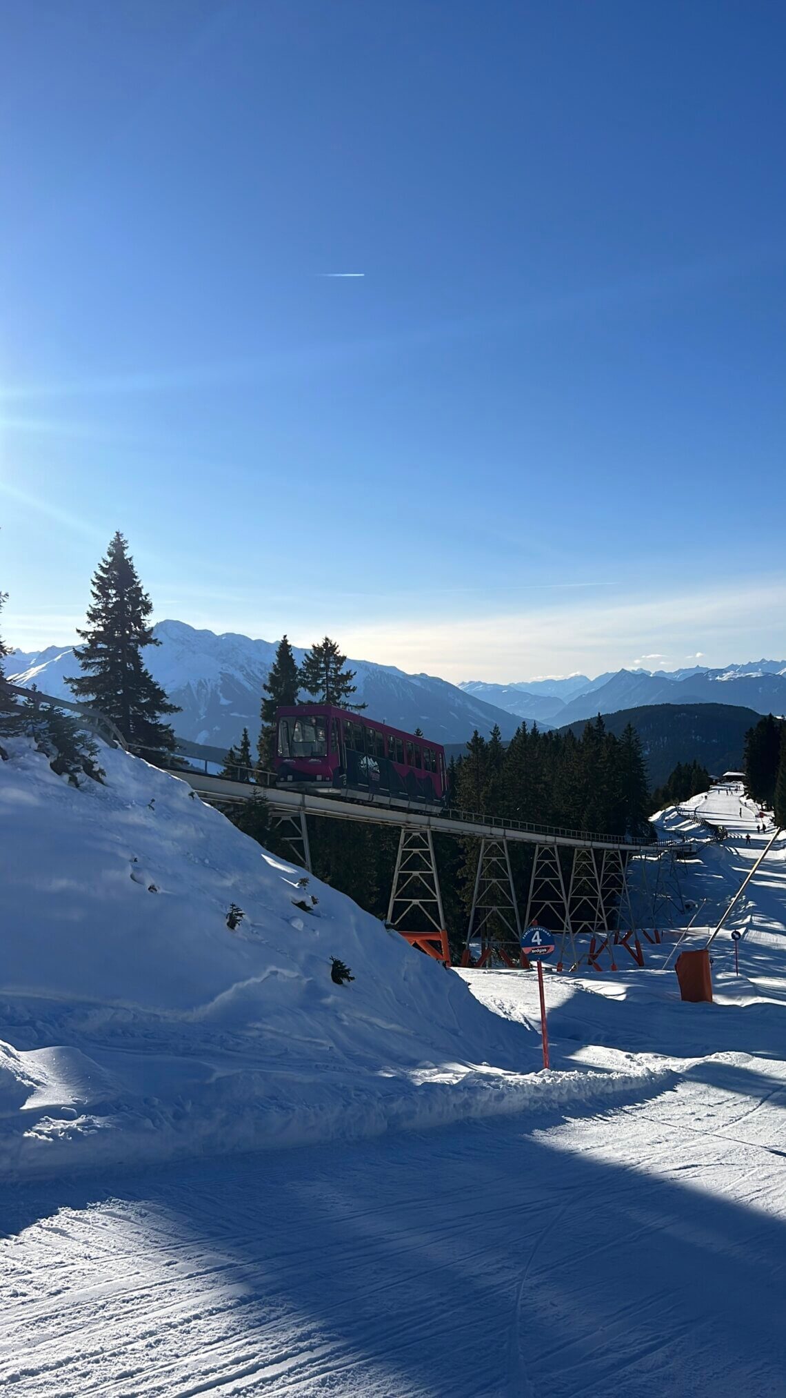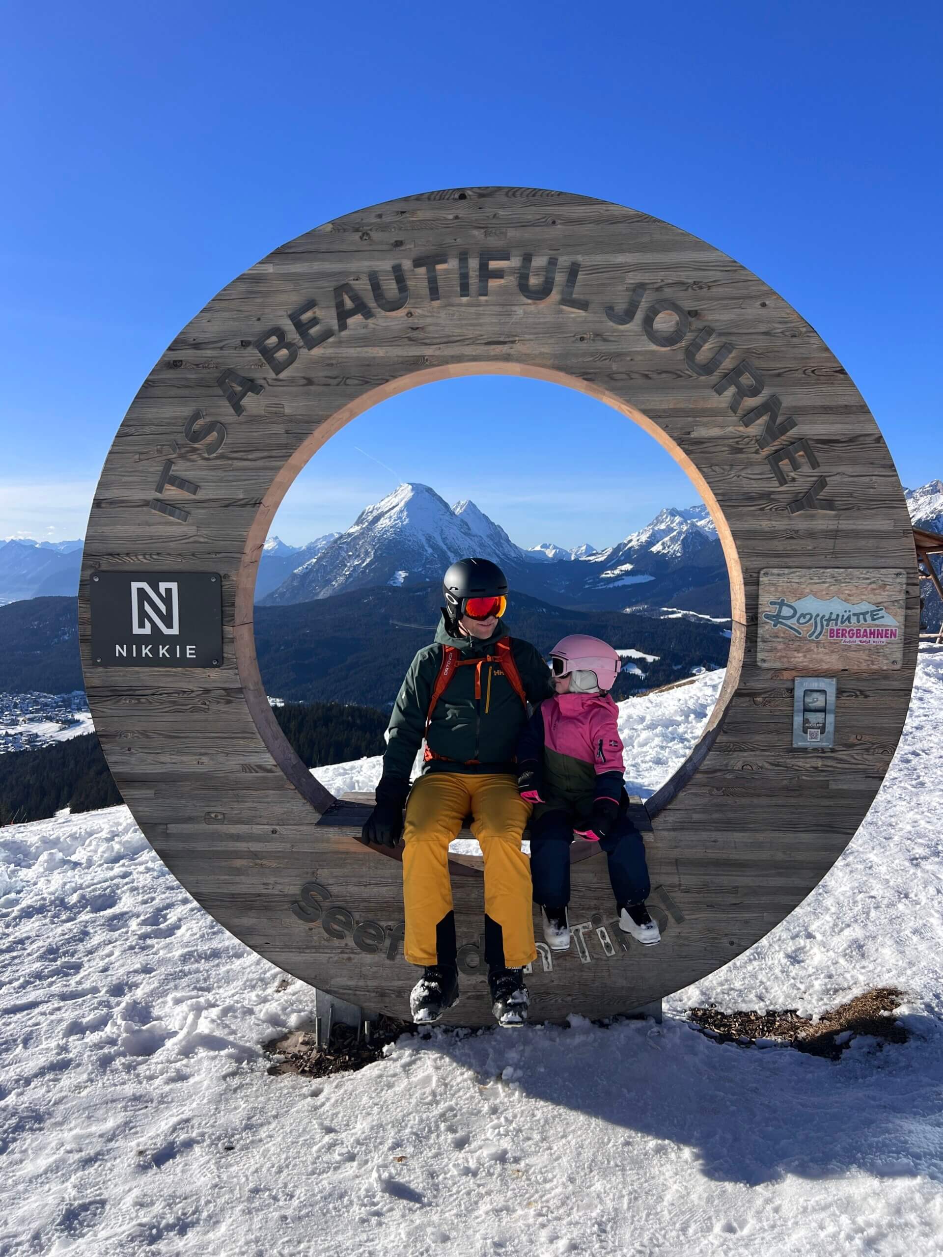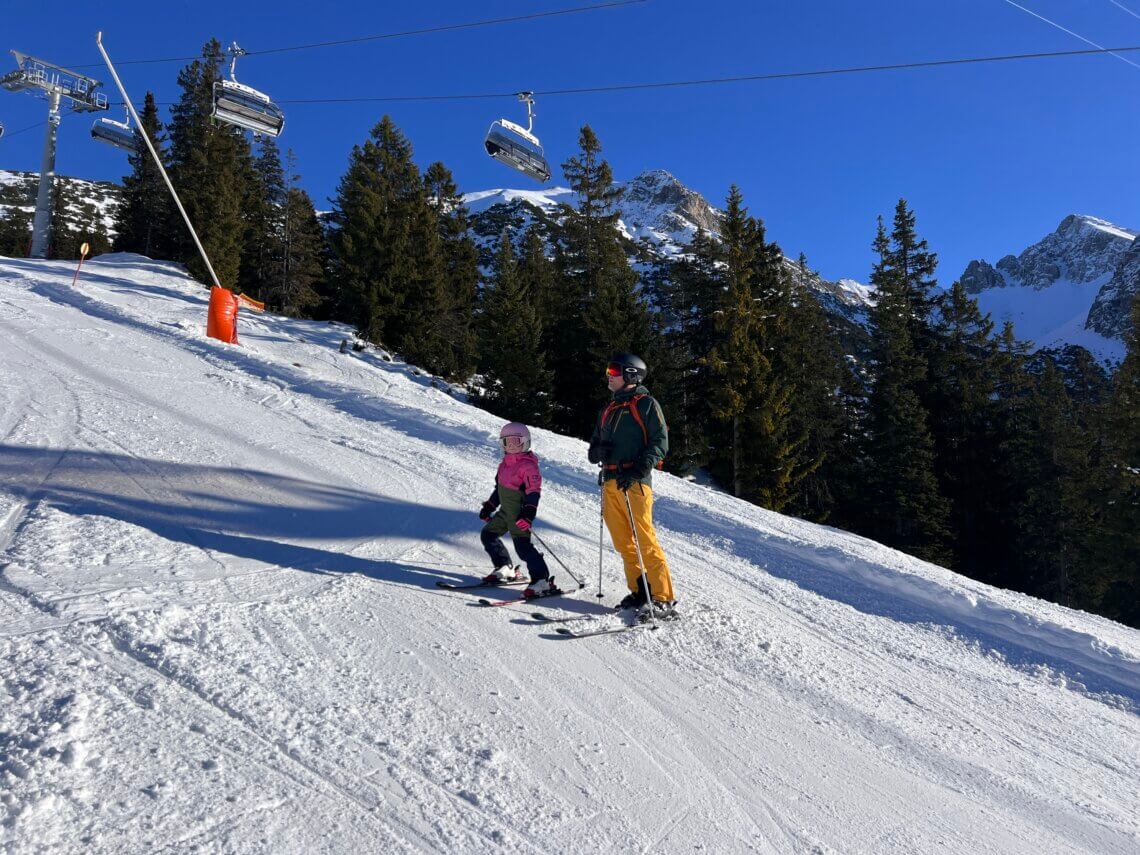 Ideaal is de centrale ligging van faciliteiten bij de lift. Vanuit de parkeergarage pakken we de roltrap omhoog naar de skiverhuur en skischool die beiden aan het centrale plein gelegen zijn. Zo hebben we binnen 10 minuten de ski’s voor onze dochter gehuurd en haar skilerares gevonden. Samen pakken we de roze funicular omhoog en starten we ons ski-avontuur in Seefeld.