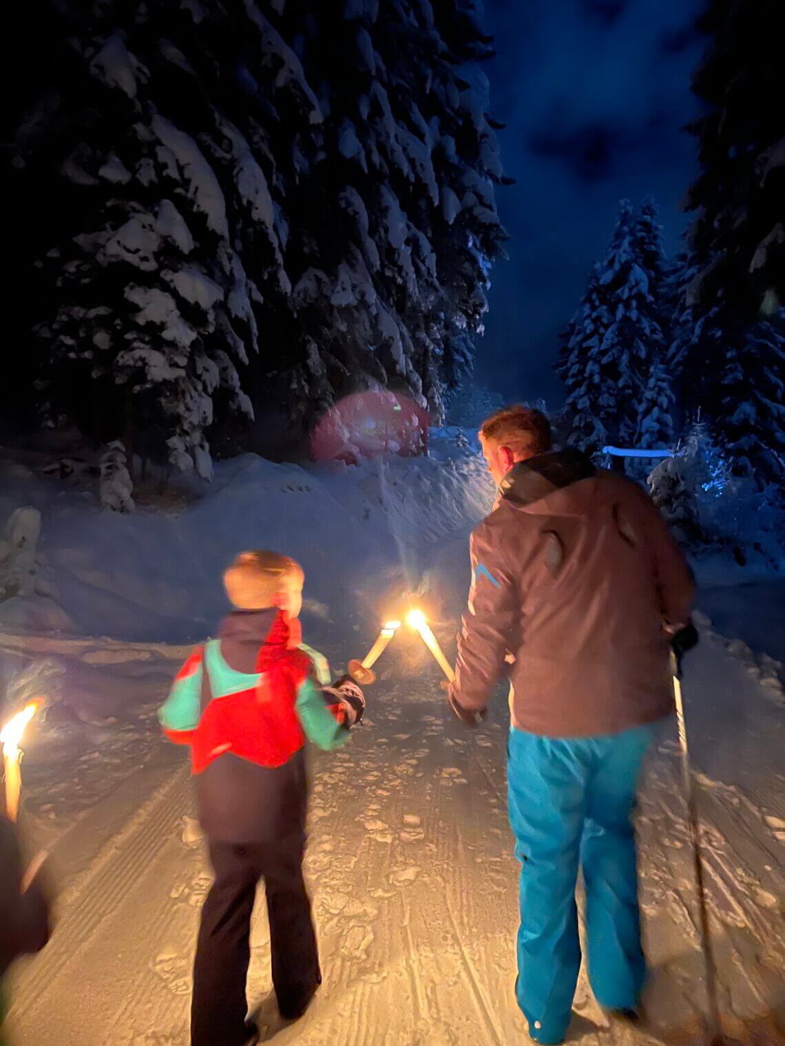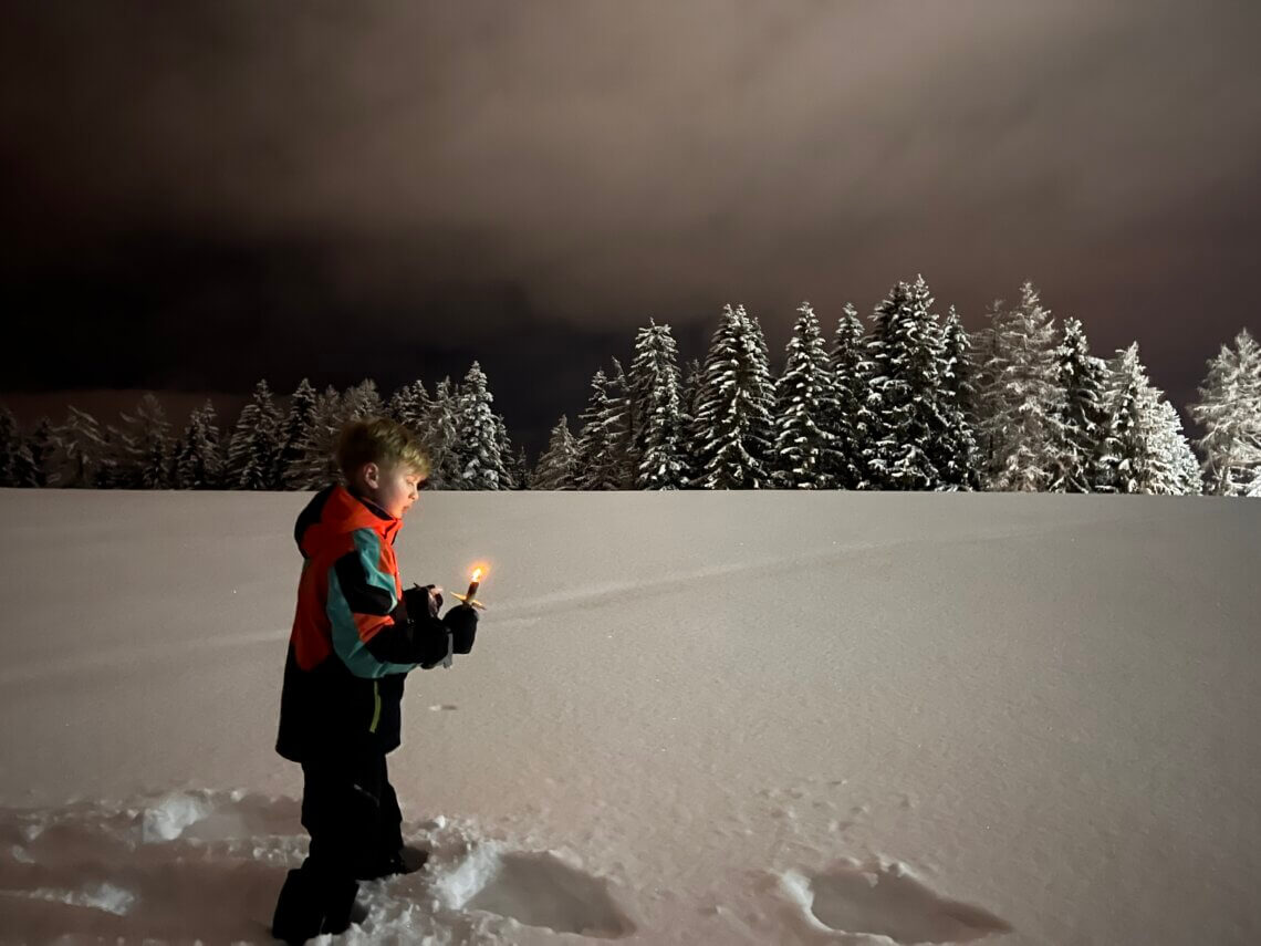 Eenmaal boven moeten we een kort stukje door een dik pak sneeuw lopen om het bos te bereiken. We lopen langs verschillende speelplekken van Youpi’s zauberwald en lossen onderweg raadsels op bordjes op. De uitzichten zijn prachtig, zeker met alle sneeuw in de bomen. De kinderen vinden het machtig om met een brandende fakkel te lopen. Net zoals wij genieten ze van de uitzichten en smelten ze sneeuw en ijspegels met hun fakkel. Halverwege de wandeling stoppen we bij een boerderij/ kruidenier en drinken we overheerlijke gluhwein en punch terwijl de fakkels in een hoop sneeuw staan.
