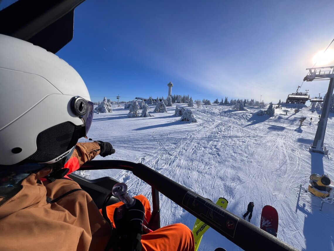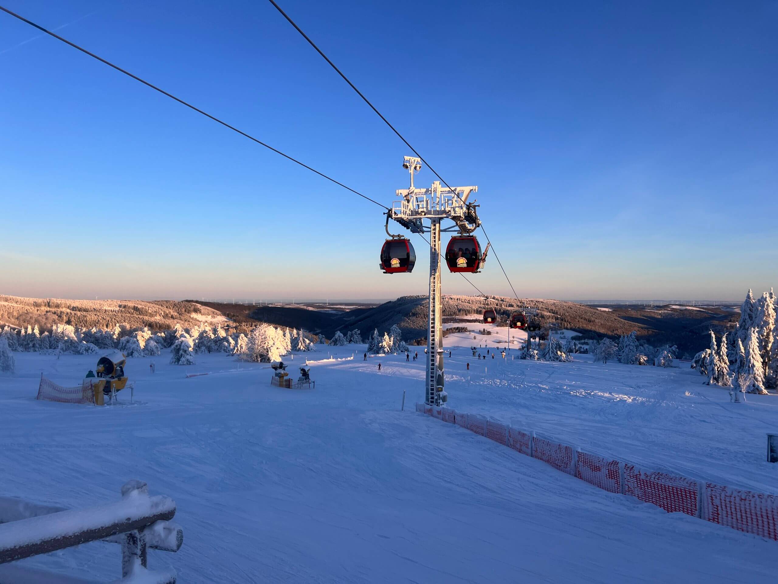 Als we aankomen bij skigebied Willingen, parkeren we onze auto op de grote, gratis parkeerplaats. Rondom deze parkeerplaats is de ticket verkoop, skiverhuur shops en skischolen. Nadat we onze skipassen hebben gekocht nemen we de Ettelsberg Seilbahn. Dit is de enige 8 persoons gondel in Sauerland en brengt ons naar de top van de de Ettelsberg op 838 meter hoogte.
