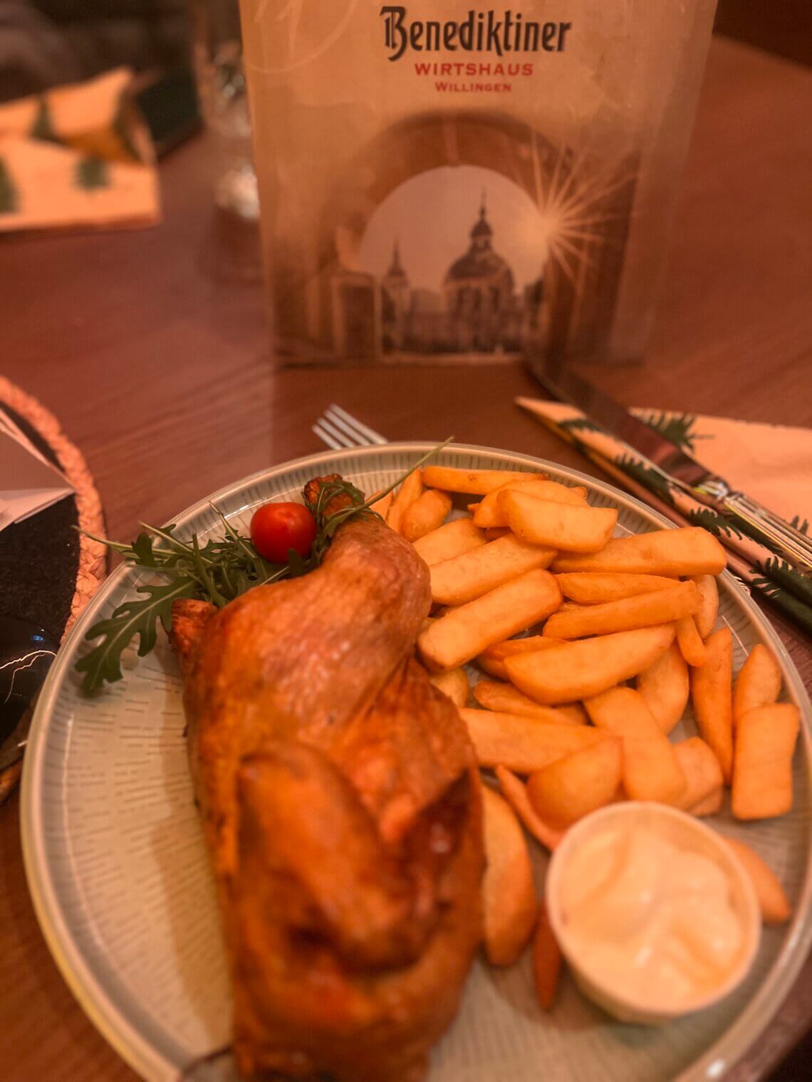 In het dorp Willingen zelf zijn diverse restaurants te vinden. Veel met een uitgebreide kaart en relatief lage prijzen. Yvonne besluit te gaan eten bij Benediktiner Wirtshaus. Op maar een paar minuten wandelen vanaf het hotel waar we verblijven. Een goede keuze, een halve kip met frietjes voor zo’n 13 euro. Mijn oudste geniet van een groot bord kaiserschmarrn.