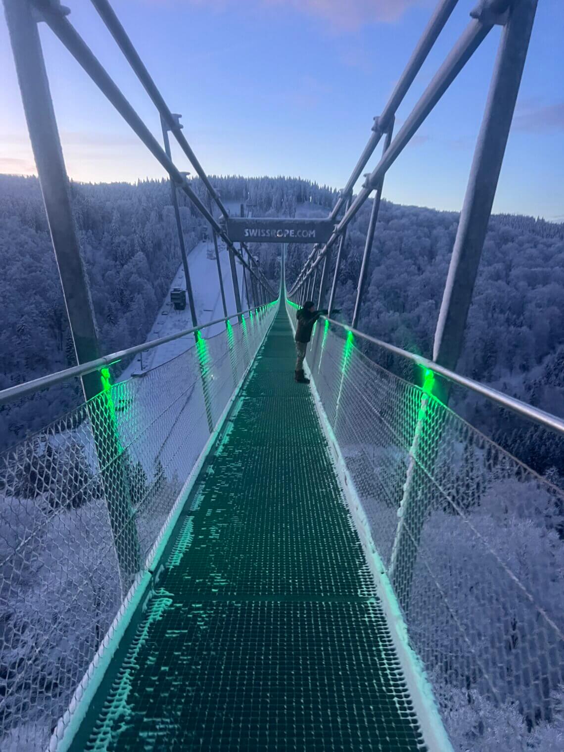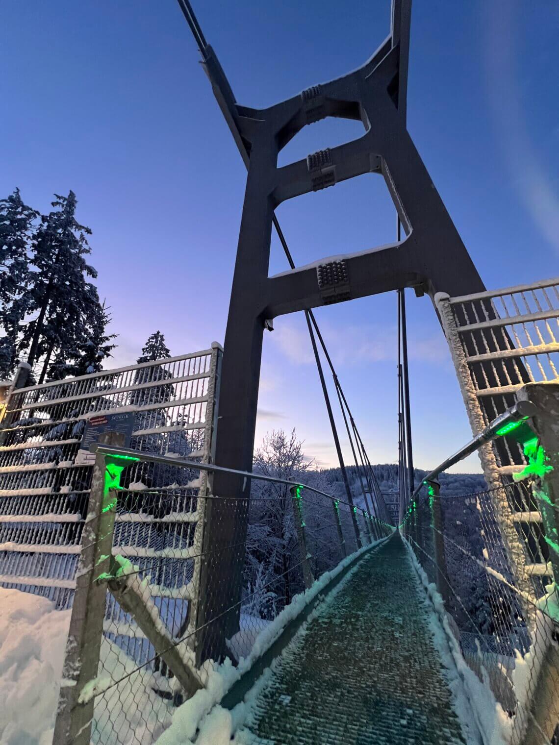 We moeten flink doorlopen, want in de winter sluit de skywalk om 17 uur. Het is wel een prachtige wandeling. Als wij er zijn heeft het net gesneeuwd. Het uitzicht op het besneeuwde landschap is prachtig! ”Kijk daar mam!” roept mijn zoon enthousiast. Om de bocht zien we de hangbrug hoog boven ons. Nog één bochtje en wat omhoog en dan zijn we er, net een paar minuten voor 17 uur. Intussen is het wat gaan schemeren en komen de lampjes van de brug extra mooi uit. In combinatie met de ondergaande zon en de sneeuw een magisch gezicht!